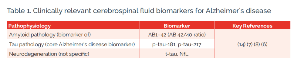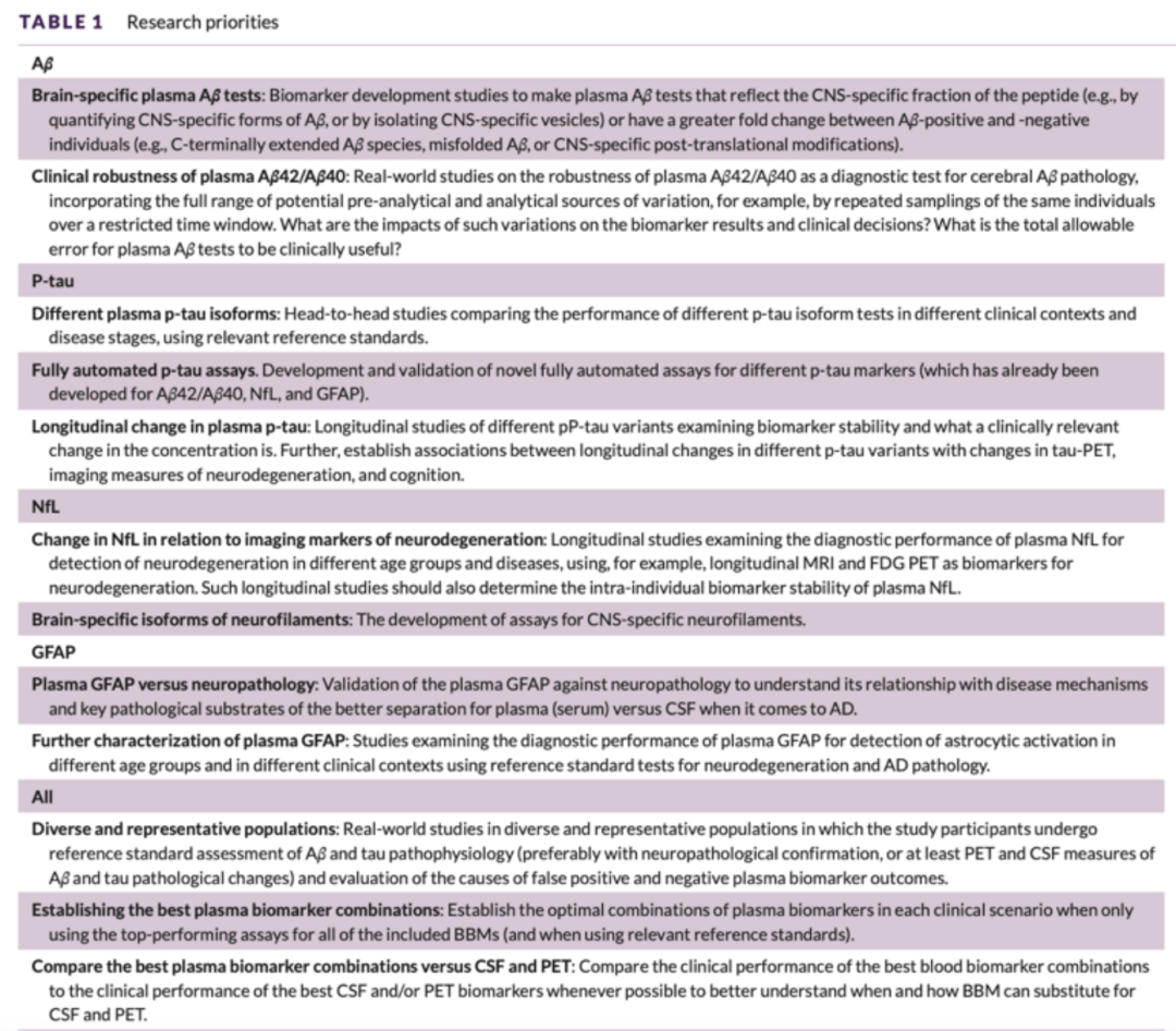 与阿尔茨海默病相关的血液生物标志物包括淀粉样蛋白片段Aβ42/Aβ40比例,磷酸化Tau蛋白,与神经损伤相关的神经纤维轻链(NfL),以及与星型胶质细胞激活相关的GFAP。文章指出,这些标志物的研究目前最为深入,已经表现出与阿尔茨海默病的强相关性。研究小组建议,这些生物标志物可以作为临床试验的(初步)筛选手段,发现适合入组接受在研疗法治疗的患者,他们仍然需要PET或者脑脊液检测来确认阿尔茨海默病症状。专家小组同时建议在专科记忆诊所中使用血液检测作为已经出现认知症状的患者的诊断流程的一部分。