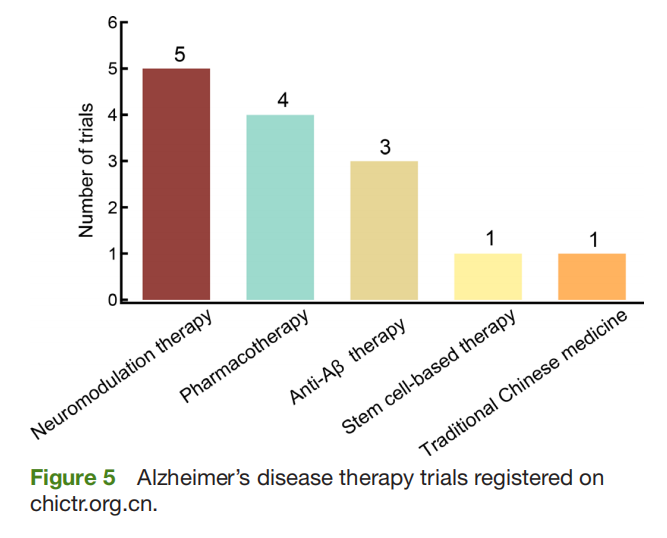 通过整理在ClinicalTrials进行的研究情况,发现在中国有97项已经完成或者正在进行的临床试验,其中41项是于2019年注册的(见图4和图5)。抗Aβ疗法、神经调节疗法、干细胞疗法和中医药是过去2年临床应用的主要方法。
