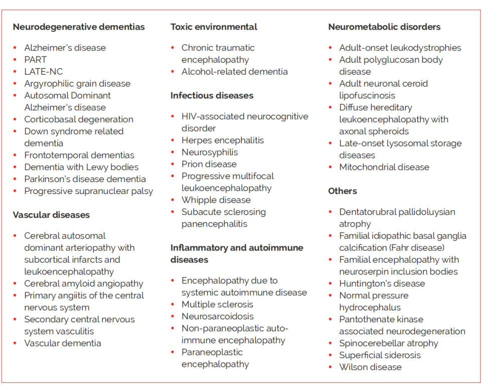 下图总结了与认知能力下降和痴呆相关的血管异常和蛋白质疾病