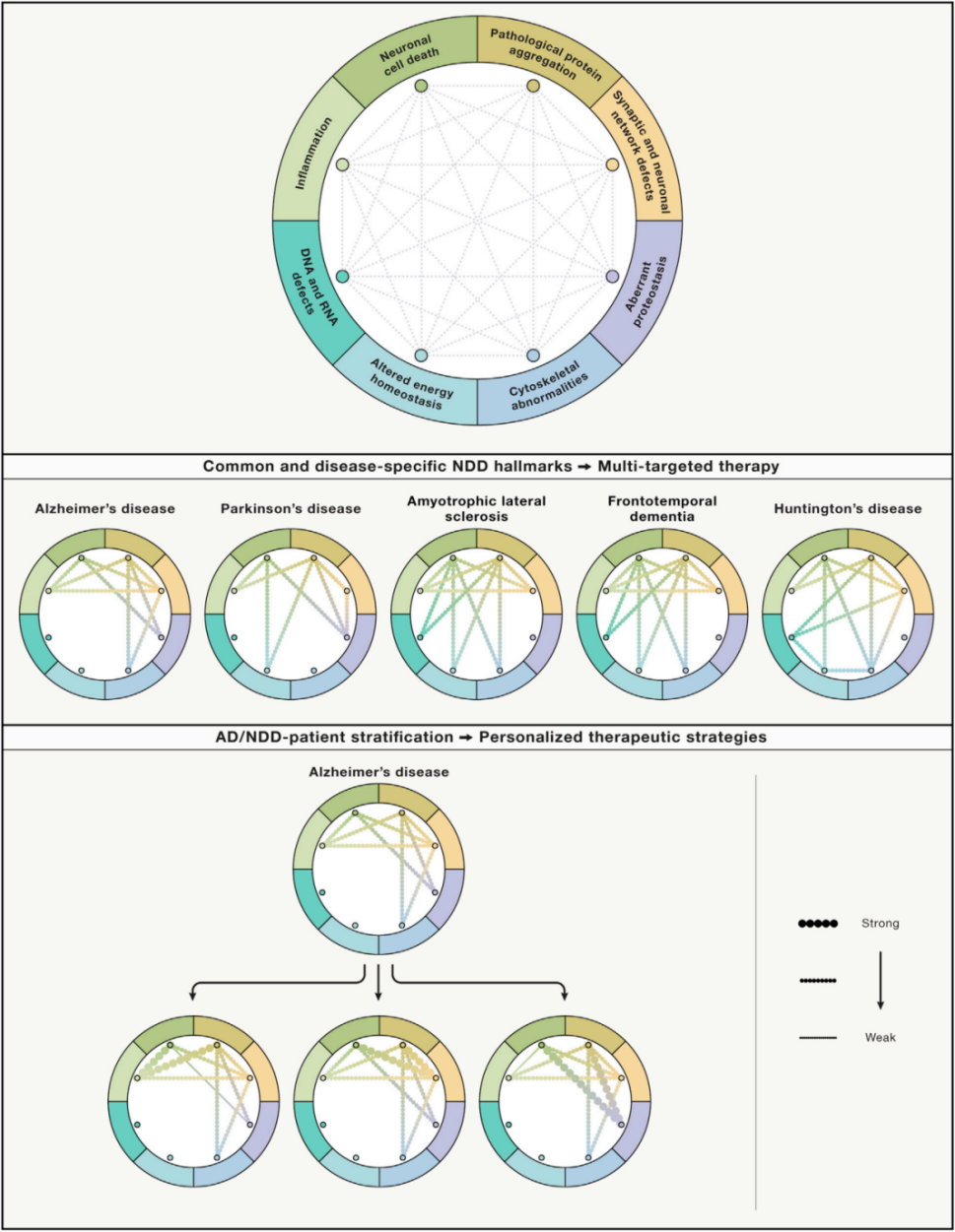 NDDs的标志及其相互联系作为一个框架分类NDDs和识别子型在NDDs,作为个性化的基础,组合和多目标治疗有效阻止NDDs (A)特点的相互联系示意图,提供一个框架研究NDDs的整体方法。该框架支持根据其主要特征对nDD进行分类,例如常见的nDD,即AD、PD、ALS、FTD和HD。(B)此外,该框架能够识别特定ndd中的患者亚型,从而根据其主要特征(B).对患者进行分层这些是由NDD侮辱,以及个体的神经元弹性和脆弱性。所示是AD中子类型的例子。因此,NDD治疗策略可以根据个体特征进行设计,从而设计个性化、多靶向治疗。