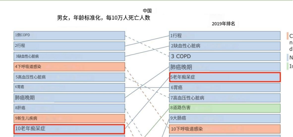 在过去的30年里,中国的AD死亡排名从1990年的第10位上升到2019年的第5位,尽管年龄标准化死亡率下降了0.39%。从1990年到2019年,中国ADRD的疾病负担从第27位上升到第15位,年龄标准化DALY增加了5.7%。