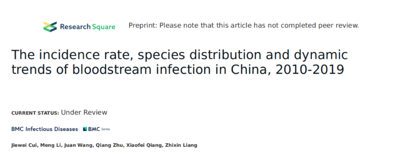 数据2:据美国CDC的数据,亚洲人群的脑膜炎球菌性疾病发病率约为1-3/10万,全球细菌性脑膜炎的全球负担是61,4万/年,这是1995年的数据。 数据3:2006-2009年,中国疾病预防控制中心牵头对我国4省近2000万人的流行病学调查数据显示,人群总体发病率为(1.84~2.93)/100000,5岁以下儿童发病率为(6.95~22.30)/100000。如果要估算所有脑膜炎的发病人数,那我们需要取两个数据,第一个数据是数据3里面的发病率2.93/10万,另一个数据是文章一开头的细菌性脑膜炎占比25%。那我们就可以大致得到中国目前每年脑膜炎的发病人数约为 16 万人(推算数据未经验证,仅供参考),同时我们纳入脑膜炎患者的检测场景,一般是高度怀疑才进行病原学检测,设定50%的检出率,此时该市场的总容量为32万测试/年。如果我们再考虑上渗透率问题和结核性脑膜炎的市场缺失,单就脑炎/脑膜炎市场的测试数据会在15万测试/年左右,假设每个测试的收费为1500元,总市场体量为2.3亿RMB/年,还算一个非常不错的小而美的市场。对于FlimArray而言,目前市场上主要面临的竞争对手是测序公司和微生物快速培养两种。而FlimArray最大的优点在于出报告的时间和NMPA注册证,这两个大优势可以让这款产品未来具备较强的竞争力,甚至说可以作为ICU床旁的快检神器。在FlimArray的所有产品panel中,我是非常看好脑膜炎和血流感染这两款产品的,因为临床客户切实存在的检测时间需求没有被很好的满足,所以做成分子POCT和多联检之后是能够找到应用场景的,至于呼吸道、肠道、生殖道这种panel就仁者见仁智者见智吧。 目前我们国内比较缺乏这块的数据,我找了好久终于找到一篇文章,中国人民解放军总医院的梁志新教授等在Research Square预先发表了一篇题为The incidence rate, species distribution and dynamic trends of bloodstream infection in China, 2010-2019的文章。
