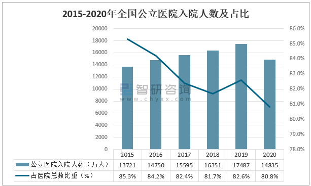 国家卫健委数据,2020年,全国公立医院入院人数14835万人,如果我们采用上文提到的6.50‰来作为系数,那住院人数中出现血流感染的人群约在96万人/年。由此可见血流感染的市场要比脑膜炎的市场更大。2015-2020年全国公立医院入院人数及占比