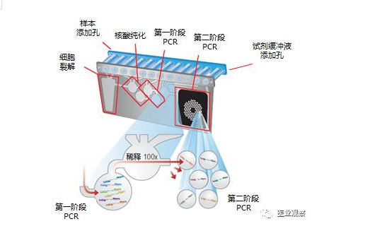 FilmArray采用的是封闭巢式多重PCR熔解曲线法,基于多重巢式 PCR 扩增和熔解曲线分析技术,对经机械研磨破碎后的样本进行检测分析。如下图是操作流程和试剂卡的原理图:在仪器运行前,操作人员只需在测试条两端分别加入试剂缓冲液和样本混合液即可,如图样本会在图示核酸提取部分完成提取纯化,然后在进行第一阶段的PCR,初步扩增DNA片段,把原始底物放大,然后在第一轮PCR扩增产物的基础上,完成第二阶段巢式PCR扩增,最后利用熔解曲线进行分析数据,得出结论。这里注意FlimArray这里使用的是巢式PCR的设计,也就是用了两对PCR引物扩增完整的片段,第二对的靶标在第一对的扩增范围内,这样可以提高灵敏度和特异性。除了FlimArray用了巢式,赛沛的GeneXpert系统的Xpert MTB/RIF产品也用了巢式PCR技术,不过赛沛在设计第二对引物的时候用的不是一对,是两条不一样的引物,所以自己也叫自己半巢式PCR,有兴趣的IVD从业者可以去深入了解一下。
