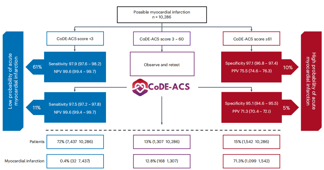 在没有心肌损伤的患者中,CoDE-ACS评分低于3分符合预先设定的诊断表现标准,阴性预测值为99.5,敏感性为90.2。在心肌损伤患者中,CoDE-ACS评分为61分或以上符合我们预先设定的诊断表现标准,阳性预测值为80.1,特异性为83.4。当心肌肌钙蛋白第一次连续测量被纳入模型时,在无心肌损伤的患者中,小于3分被鉴别为低概率心肌梗死的患者,阴性预测值为99.5,敏感性为95.5,而在心肌损伤的患者中,大于61分被鉴别高概率心肌梗死的患者,阳性预测值为82.5,特异性为80.1。