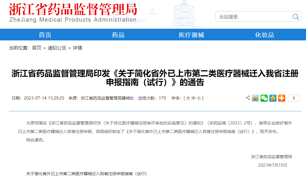 关于简化省外已上市第二类医疗器械迁入我省注册申报指南(试行) 根据《医疗器械监督管理条例》《医疗器械注册与备案管理办法》《体外诊断试剂注册与备案管理办法》和国家药品监督管理局《关于进口医疗器械产品在中国境内企业生产有关事项的公告》(2020年第104号),结合原国家食品药品监督管理总局《关于境内医疗器械生产企业跨省新开办企业时办理产品注册及生产许可有关事宜的公告》(2015年第203号)等文件要求,制订本指南,有关内容如下: 一、适用范围 跨省新开办、迁入、控股或属同一集团的省内企业,申请将已获省外第二类医疗器械注册证且在有效期内的产品迁入我省注册。 二、受理标准 (一)根据现行的医疗器械分类目录及有关分类界定文件,拟申报产品的管理类别明确为第二类医疗器械。 (二)拟申报产品与已取得的注册证产品为同一品种器械,产品不发生实质性变化。 (三)拟申报产品应符合以下情形之一: 1.注册申请人为省外已获证注册人在我省新开办的子公司; 2.注册申请人为省外已获证注册人整体跨省搬迁到我省; 3.省外已获证注册人已通过收购、兼并、重组,实现对省内注册申请人的控股,或省内注册申请人通过收购、兼并、重组,实现对省外已获证注册人的控股; 4.注册申请人和省外已获证注册人属于同一集团下的企业。 (四)拟申报产品应是首次按照本指南规定来我省注册申报,如该产品存在因审批决定不予注册或注册申请人自行撤回的情形,该产品再次申报注册时按照常规程序开展审评审批。 三、办理流程 (一)申报前预审 省药品监督管理局(以下简称省局)建立申报前预审机制,注册申请人在正式注册申报前,应向省局行政受理中心(以下简称受理中心)申请预审,并提交《已上市产品迁入浙江省注册申报预审申请表》及相关的支持性资料。申请预审时,注册申请人应已取得符合法规要求的注册检验报告。受理中心主要对资料的完整性,及对本指南第二条第(三)款要求的符合性进行审查。审查符合要求的,予以受理并将资料移交省医疗器械审评中心(以下简称器械审评中心)。 器械审评中心组织人员对预审申请进行审查,重点对申报产品与拟迁入上市产品的一致性进行分析,必要时与企业进行沟通,最终对预审申请是否适用本指南出具技术意见,并报送省局。 省局对器械审评中心出具的技术意见审核后,将结果告知受理中心,受理中心在《已上市产品迁入浙江省注册申报审查通知单》上加盖浙江省药品监督管理局医疗器械注册专用章后送达注册申请人,并抄送器械审评中心和省药品检查中心(以下简称检查中心),送达时受理中心通知注册申请人提交注册质量管理体系核查资料。 (二)注册核查 注册申请人应承诺主要原材料和生产工艺不发生改变,并按照《关于公布医疗器械注册申报资料要求和批准证明文件格式的公告》(国家药品监督管理局2021年第121号)、《关于公布体外诊断试剂注册申报资料要求和批准证明文件格式的公告》(国家药品监督管理局2021年第122号)和《医疗器械注册质量管理体系核查指南》提交注册质量管理体系核查资料。 检查中心在收到注册质量体系核查资料后5个工作日内启动核查,注册核查应重点关注变更生产过程可能带来的体系变化是否会产生新的风险,引起注册事项的变更。注册申请人委托生产的,生产地址与迁入产品为同一地址,注册核查重点关注注册申请人的体系符合性以及样品生产的真实性。 注册核查可以与生产许可现场核查联合开展,联合检查要求按照省局相关文件执行。 (三)注册申报资料 1.注册申请人按照《关于公布医疗器械注册申报资料要求和批准证明文件格式的公告》《关于公布体外诊断试剂注册申报资料要求和批准证明文件格式的公告》等要求,向受理中心提交注册申报资料。其中,医疗器械/体外诊断试剂产品的综述资料、非临床资料(不含注册检验报告)、临床评价资料,可提交迁入产品的原注册申报资料。 2.提交符合本指南第二条第(三)款的证明性文件,包括但不限于以下资料:公司章程、营业执照、注册申请人与原医疗器械注册人的股权关系证明文件(如说明文件、相关协议、质量责任、股权证明等)。 3.申报产品与迁入产品的对比情况及差异性评价结论。注册申请内容,除注册人名称、住所、生产地址外,原则上应当与迁入产品注册证及其附件载明的相关事项保持一致。 4.迁入产品的注册证、所有变更批件、说明书、技术要求复印件及相关检验报告。历次变更注册情况以及产品获批后强制性标准与注册指导原则发布与执行情况等。 5.承诺书。承诺提交的迁入产品原注册申报资料与在外省市注册时一致,迁入产品上市后未发生过严重质量事故、无未办结涉及产品安全有效的诉讼。 6.迁入产品注册人同意注册申报的声明和授权文件。声明同意注册申请人进行注册申报,授权注册申请人使用相应原产品注册申报资料,确保与此次注册申请的相关性和支持性。 7.《已上市产品迁入浙江省注册申报审查通知单》。 (四)技术审评 对产品分类明确、注册申报时提交的临床评价报告支持医疗器械在其适用范围下的安全性与有效性的,技术审评时可仅对产品检验报告采纳强制性标准的完整性、体外诊断试剂类产品适用的国家标准品检测情况进行审查,技术审评时限不超过5个工作