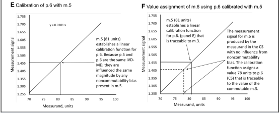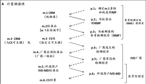 在计量上可溯源的校准等级中 哪个校准品必须与临床样品是可互换的 使用不同终端用户的体外诊断设施(IVD-MD)检测临床样品中相同被测量具有等同结果,是为诊断、治疗、监视、或风险评估是必须的。ISO 17511:2020规定了如何建立计量溯源性到较高等级可用的参考系统成分,使得在IVD-MD间有等同的结果。与临床样品(CS)互换性是参考物质在校准等级中作为一个校准品的必须特性。但是,在校准等级中不是所有校准品被要求是可互换的;不同校准等级对哪个校准品必须与CS具有可互换具有不同的要求。因为互换性的评估是一个艰巨的努力,所以,重要的是,在实施某个校准等级时,确定哪些校准品需要可互换的。我们提供了一个指导,在纠正任何不可互换的偏移是适当下,哪些校准品必须与CS是可互换的;以及在ISO 17511:2020中,叙述的各个类型校准等级中,没有要求校准品与CS的互换性。 背景 使用不同终端用户的体外诊断设施(IVD-MD)检测临床样品中相同被测量具有等同结果,是为诊断、治疗、监视、或风险评估是必须的。ISO 17511:2020规定了如何建立计量溯源性到较高等级可用的参考系统成分,使得在IVD-MD间有等同的结果(1)。计量溯源性是通过系列校准步骤的一个不间断链,从可用的最高参考物质(RM)和/或参考检测程序(RMP),到临床样品(CS)的最后结果。一个IVD-MD的最合适的计量溯源性是SI制单位,其中计量溯源性被校准等级确定,开始于较高等级RN或RMP,依从了各自ISO 15194(2)或15193(3)标准。 计量溯源性到较高等级的参考系统组分。使得在不同时间和地点,和不同终端用户IVD-MD间得到一致的校准等级。ISO 17511:2020叙述了校准等级的示例,说明溯源性到SI和较高等级的参考系统组分是可能的,其他情况仅为可用的技术方式,是校准等级没有包括较高等级RM和/或检测程序(MP),作为厂商选定的指定RM(1)。 ISO 17511:2020在多个地方提示了RM互换性和校准品可应用在给定校准等级处的重要性。但是,没有提供明确的指导,在一个等级内的特定校准品,必须与CS是可互换的,或互换性不是必须的。一个校准品未被检出的不可互换性,会引起某个MP具有偏移。因为评估互换性是一个很艰巨的努力,很重要的是确定,在实施IVD-MD的校准等级中,哪个校准品需要与CS是可互换的。 国际计量学词汇定义参考物质的互换性:对于给定物质的规定量,由两个给定测量程序(MP)得到的测量结果间关系,与其他指定物质测量结果间关系一致程度表示的参考物质(RM)的特性(4)。在检验医学,“其他指定物质”是临床样品(CS)。互换性可以定义为:更有功能的叙述,为某个RM的特性,以两个或更多的检测系统检测,对RM的检测响应,与含有相同规定被测量的量临床样品是相同的。 在合适相应下,某个RM的互换性可以按照文献的技术叙述予以评估(5-7)。一个溶液的基质包括所有除了分析物外的所有分子和离子。在校准物质的基质,与CS的基质有足够差异下,将偏移引入某个MP的校准等级,引起了不可互换性。在相应环境下,不可互换性的偏移可以在添加某个纠正步骤到校准等级中去除(8)。 本报告中,在ISO 17511:2020中叙述的一些校准等级通用模式中,我们提供了指导,就某个校准等级中哪些校准品,必须与CS是可互换的,何时对不可互换性的偏移的纠正是合适的,何时一个校准品的互换性不是要求的。因为在ISO 17511:2020展现的校准等级模式,会应用在被不同IVD厂商各个不同配置到适应可用的RM和MP,这里给出的示例,代表了特定的实施,去展现逻辑被应用去确定,是否在某个特定校准等级中对校准品要求互换性。展现的概念也可被应用到需要的校准等级的各个其他需要的基质等级的配置。 在要求和不要求校准品的换性的指导和示例 在图1、2和3中,展现的校准等级中的每个步骤,按照ISO 17511:2020确定的习俗标记缩略号。这些缩略号确定了检测程序的标准等级水平(指定为p.1到p.6),和校准物质(设定为m.1到m.6)在确定的校准等级内每个在水平处展开。对每一个这些标准词语以及详细解释,在计量上可溯源的校准等级内在ISO 17511:2020内给出相应缩略号,并总结在表1中。 一个 “完整”计量溯源性到SI,如在ISO 17511:2020,5.2内叙述的,被展现在图1A。被广泛接受的做法是,使用一组真实CS(m.3),将一个p.3 RMP的值转换到m.4和/或p.6终端用户IVD-MD,对于m.3 RM去用于临床实验室为CS(m.6)确定值。按照定义一组真实CS被接受为可互换的,以及被选定的CS组在制备和储存中没有变化,该组没有包括具有干扰物质或其他标本-特定的已知影响的CS,会不利地影响p.4 MP的性能,其中该组CS被用于进行校准(5)。作为p.5常设MP的校准品的功能,m.4厂商的应用校准品(一级批校准品),通常由IVD-MD厂商制备,应是稳定和可用许多年,去支持未来正在序列批的m.5终端用户IVD-MD校准品设定值(该校准品一年内有多批)。使用m.4应用校准品,替代了m.3一组CS。去校准p.5常设MP,为此节省了连续的、设定值、和保持CS组等的费用。 若可能,可要求替代一个有证参考物质(CRM),它与该组CS处于m.3位置的是可互换的,使得IVD-MD厂商在实施计量溯源性较早,并较少的费用。同于m.3位置的CRM,为二级CRM,有别于在m.1位置的一级(纯物质)CRM。二级m.3 CRM经常具有的基质类似于CS,促使与未改变的CS具有互换性。为该被测量的可互换的m.3 CRM,由国家计量研究院产生,预期被用于所有IVD厂商,作为它们各自的内部基质等级,去实现为CS在许