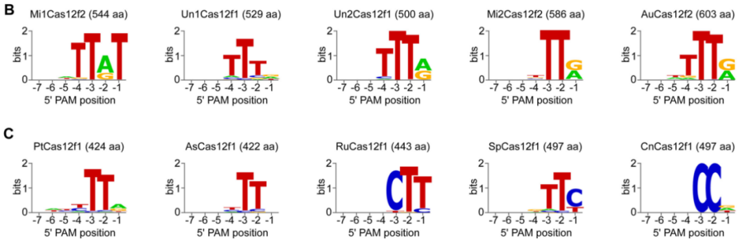 Virginijus Siksnys团队2020年在《Nucleic Acids Research》发表的文章PAM recognition by miniature CRISPR–Cas12f nucleases triggers programmable double-stranded DNA target cleavage[1]。文章表明,Cas12f(旧称Cas14)不但能够靶向ssDNA[2],而且也具有PAM依赖性靶向dsDNA的活性。这与前期Jennifer Doudna团队发现Cas12f只能切割靶标ssDNA的结论不同[2]。因此,Siksnys的工作不仅修正了我们之前对于Cas14家族切割靶标的认知,更为Cas14家族的使用提供了更广阔的前景。 大家熟悉的Cas9、Cas12、Cas13蛋白,它们的分子量都偏大,这对于将该系统递送入细胞是不利的,这可能会限制它们的某些应用。而该文所研究的Cas12f蛋白的分子量则普遍只有400~700 AA,几乎是最小的Cas9或Cas12蛋白的一半。 与Cas12a蛋白的比较可以发现,Cas12f主要差异位于蛋白的N端,Cas12f蛋白的N端明显要短了许多(图1)。由于这一差异,先前的研究认为其可能是V型CRISPR/Cas系统进化的残留物或中间体,可识别和剪切ssDNA,而不具备识别和剪切dsDNA的能力[2]。 图1.Cas14在蛋白N端比Cas9与Cas12短很多[1] 研究者使用了之前报道的方法[4]来寻找Cas12f所对应的PAM序列。他们首先构建了一个含7-bp随机PAM的质粒文库(图2),靶标的spacer长度取决于这些Cas12f系统在各自菌株中观察到的平均长度。接着,他们体外转录并纯化了这些Cas12f的sgRNA,sgRNA中的spacer长度暂定为20 nt。然后,他们在大肠杆菌中表达各种Cas12f蛋白,收菌后在含PMSF的lysis buffer中超声裂解,直接取裂解产物的上清,加入RNase抑制剂与纯化后的相应sgRNA,得到Cas12f/sgRNA复合体。 下一步,该复合体被直接用于剪切随机PAM文库,剪切完成后的双链DNA为粘性末端。接下来,为了测序,要先用T4 DNA聚合酶补齐为平末端,再用Taq酶对3′端进行了加A处理,去除RNA并纯化后,将加A产物与3′-dT的双链DNA接头进行连接,之后即可进行PCR扩增并测序得到这些剪切产物中的PAM。最后,研究者们就得到了各种不同Cas12f对PAM的偏好(图3)。结果表明,大多数Cas12f偏好富T的5′-PAM序列。 图3.不同Cas12f蛋白识别和剪切dsDNA的PAM序列偏好[1] 确定了这些Cas12f的PAM偏好后,研究者又进一步以纯化的Un1Cas12f1蛋白为对象,探索了其dsDNA剪切的最佳反应条件。结果表明,Un1Cas12f1是一种Mg2+依赖性的核酸内切酶,在低盐浓度(5-25 mM)下功能最佳,在∼37-50℃的宽温度范围内具有活性,最佳温度为∼46℃,sgRNA的最佳spacer长度为~20 nt。在此优化的反应条件下,Un1Cas12f1能够将超螺旋质粒DNA完全转化为线性形式(图4)。突变失活两处RuvC活性位点会消除这种剪切活性,证实了RuvC结构域对于这一剪切活性至关重要(图5)。 图4. 最佳反应条件下,Un1Cas12f1能够将超螺旋质粒完全转化为线性形式[1] 图5. Un1Cas12f1对dsDNA的剪切需要依赖RuvC结构域[1] 他们首先在大肠杆菌中转入了一个质粒,该质粒可以表达Cas12f蛋白以及T7转录相应的sgRNA。接着,在该能够产生Cas12f与sgRNA的大肠杆菌中,通过电转化引入携带靶标序列的低拷贝质粒。最后,将这些细胞10倍梯度稀释后生长于含有诱导剂与抗生素的平板上。 图6.能表达Un1Cas12f1与转录sgRNA的质粒[1] 实验结果令人意外,大部分的Cas12f并没能干扰低拷贝靶标质粒的进入,与对照组的生长情况没有肉眼可见的区别(仅AsCas12f1与SpCas12f1产生了显著的质粒干扰)。不过,这与先前的一项研究结果是一致的——Un1Cas12f1不能耗尽大肠杆菌中的PAM质粒文库,这也可能是它没有被检测到PAM依赖性的dsDNA剪切活性的原因之一。作者在文中也没有对这一现象做进一步的推测(图7)。 图7.大部分Cas12f不能在大肠杆菌中产生显著的质粒干扰[1] 参考文献: [1].Karvelis T, Bigelyte G, Young JK, Hou Z, Zedaveinyte R, Budre K, Paulraj S, Djukanovic V, Gasior S, Silanskas A, Venclovas Č, Siksnys V. PAM recognition by miniature CRISPR-Cas12f nucleases triggers programmable double-stranded DNA target cleavage. Nucleic Acids Res. 2020 May 21;48(9):5016-5023. doi: 10.1093/nar/gkaa208. PMID: 32246713; PMCID: PMC7229846. [2].Harrington LB, Burstein D, Chen JS, Paez-Espino D, Ma E, Witte IP, Cofsky JC, Kyrpides NC, Banfield JF, Doudna JA. Programmed DNA destruction by miniature CRISPR-Cas14 enzymes. Science. 2018 Nov 16;362(6416):839-842. doi: 10.1126/science.aav4294. Epub 2018 Oct 18. PMID: 30337455; PMCID: PMC6659742. [3].Makarova KS, Wolf YI, Iranzo J, Shmakov SA, Alkhnbashi OS, Brouns SJJ, Charpentier E, Cheng D, Haft DH, Horvath P, Moineau S, Mojica FJM, Scott D, Shah SA, Siksnys V, Terns MP, Venclovas Č, White MF, Yakunin AF, Yan W, Zhang F, Garrett RA, Backofen R, van der Oost J, Barrangou R, Koonin EV. Evolutionary classification of CRISPR-Cas systems: a burst of class 2 and derived variants. Nat Rev Microbiol. 2020 Feb;18(2):67-83. doi: 10.1038/s41579-019-0299-x. Epub 2019 Dec 19. PMID: 31857715; PMCID: PMC8905525. |