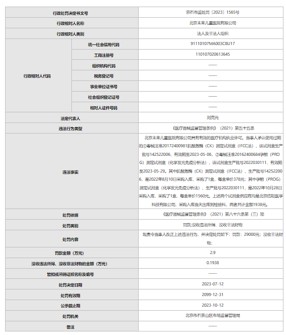 北京市市场监督管理局近期发布的消息显示,北京未来儿童医院有限公司违反《医疗器械监督管理条例》相关条款被处罚。 根据处罚信息,北京未来儿童医院有限公司具有有效的医疗机构执业许可,其承认使用过期的: ①粤械注准20172400XXX肌酸激酶(CK)测定试剂盒(IFCC法),该试剂盒生产批号142522XXX、有效期至2023-05-06; ②粤械注准20162400XXX孕酮(PROG)测定试剂盒(化学发光免疫分析法),该试剂盒生产批号2022030XXX、有效期至2023-05-29。 其中肌酸激酶(CK)测定试剂盒(IFCC法),生产批号142522XXX,是2022年8月10日采购入库,采购了1盒,每盒单价378元;孕酮(PROG)测定试剂盒(化学发光免疫分析法),生产批号2022030XXX,是2022年10月28日采购入库,采购了1盒,每盒单价1560元。上述两个试剂盒供应商均是北京倍耘医学科技有限公司,采购入库当天出库到检验科,两者共计金额1938元。 北京市石景山区市场监督管理局称,根据《医疗器械监督管理条例》(2021)第八十六条第(三)项,责令北京未来儿童医院有限公司改正上述违法行为,并决定罚款29000元,没收非法财物。 天眼查数据显示,北京未来儿童医院有限公司成立于2016年,法定代表人是刘克元,是北京泽洋房地产开发有限公司的全资子公司。 北京未来儿童医院 北京未来儿童医院是一所集医疗、保健、康复、预防、科研、健康教育为一体的现代化综合性儿童专科医院,是京西地区首家专科儿童医院。医院设有小儿内科、中医科、皮肤科、预防保健科、眼科、耳鼻咽喉科、儿童保健科、检验科、药剂科、医学影像科(彩超、DR)心电图检测等。 |