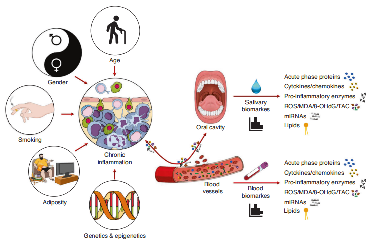炎症环境首先受到触发事件的影响,从而决定不同数量和类型的免疫细胞的募集,并相应地决定促炎介质的多样化释放。然而,有几个因素可以导至炎症的血清生物标志物的动态变化,包括年龄、肥胖、性别、饮食、吸烟、遗传、药物消耗和肠道微生物群。