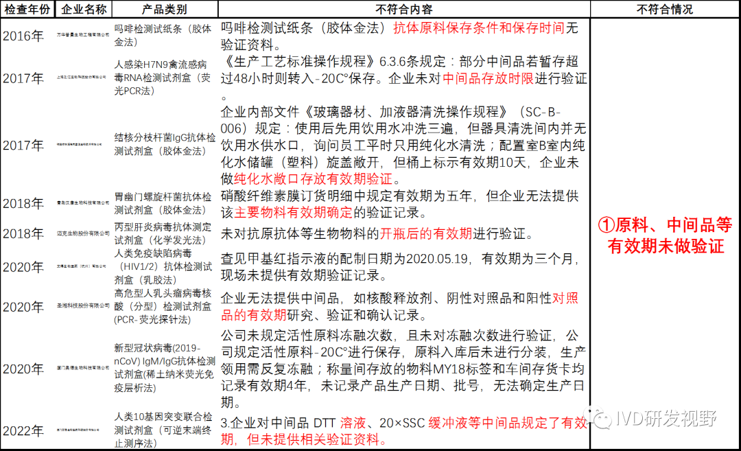仅统计2016-2023历年飞行检查IVD企业中关于验证的不符合项,如果是无菌和植入器械,关于验证的缺陷项会更多,所有产品类别验证相关不符合项达到367条。按医疗器械GMP的章节进行统计分析,可以看出不符合项主要集中在设备、生产管理、设计开发章节。 按验证不符合的情况进行统计分析,可以看出不符合项主要集中在未做物料有效期验证、清洁消毒验证、设备验证方面。 以下是上述不符合项的具体内容。①原料、中间品等有效期未做验证。