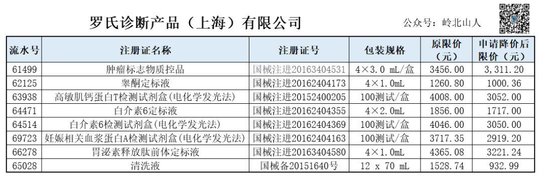 2023年4月17日,罗氏主动在安徽下调产品价格,白介素6检测试剂盒(电化学发光法)从4046元调整为3050元,降幅25%非试剂盒的产品中,清洗液降幅最高,达到39%。