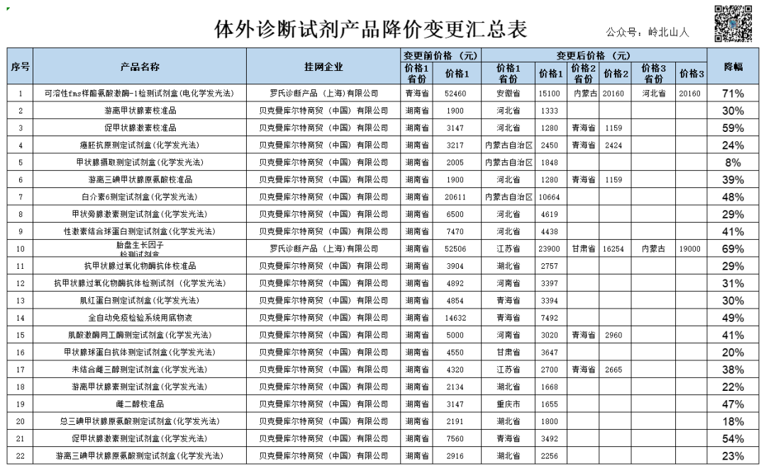 2023年7月14日,青海省药品采购中心发布文件, 根据企业申请,对部分体外诊断试剂的价格进行调整。罗氏诊断的可溶性fms样酪氨酸激酶-1项目,从52460元下降到15100元,降幅为71%;同样是罗氏的胎盘生长因子,从52506元降到16254元,降幅为69%。