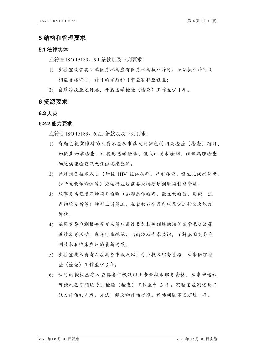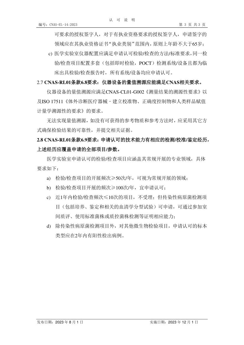 8月1日,中国合格评定国家认可委员会(CNAS)发布通知,CNAS-CL02-A001:2023《医学实验室质量和能力认可准则的应用要求》和CNAS-EL-14:2023《医学实验室认可受理要求的说明》已完成修订工作,于2023年8月1日发布,2023年12月1日实施。