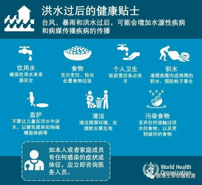 当“杜苏芮”在福建登陆时,我还怀着轻松的心情在网上看各种段子,觉得它离我太遥远。 几天后北京大雨,发布暴雨红色预警,我仍然没太在意,当车行驶在越来越深的积水中,开车犹如行船时,我感到恐惧了。 当越来越多房山、门头沟、涿州的洪水视频不断出现时,我越来越感到不安也为自己的傲慢和无知而自责。 接下来我一直思考我如何能为水灾中或水灾后的群众贡献一点点自己的力量,于是写了这篇文章。 一、水传播疾病(Waterborne diseases) 水传播疾病(Waterborne diseases)是指由水传播的病原微生物引起的疾病。这些疾病可在洗澡、洗涤、饮水或食用接触污染水的食物时传播。以往人们主要关注的病原都是通过空气传播(如流感病毒、新冠病毒)、接触传播(如猴痘病毒)、垂直传播(HIV)的病原,对于水传播疾病大部分是通过污染的水经黏膜或消化道感染,经粪-口途径传播的病原需要重点关注。 1.主要水传播寄生虫 2.主要水传播细菌 3.主要水传播病毒 4.主要水传播动物病原 对于动物的水传播病原的资料不是很多,我查阅资料整理了一部分又按照我自己的理解添加了一部分,可能有错误。大家如果有比较系统的资料可以分享给我,希望对需要的人能有所帮助。 二、洪水后预防人间传染病的措施: