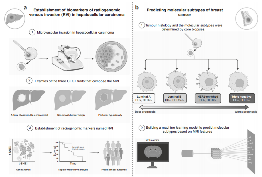 影像组学是一个快速发展的领域,它允许将放射摄影图像进行数字解码,获得定量信息,如强度、纹理、形状和尺寸指标,然后对这些数据进行过滤、聚类和分析,以识别和预测肿瘤异质性。随着我们进入精准医疗和大数据的下一个时代,许多专家提出了“放射基因组学”的概念。放射基因组学侧重于发展医学成像和基因组数据之间的多尺度连接,通过将肿瘤表型的定量成像特征与基因组特征联系起来,开发无创预后和诊断方法来识别治疗的生物标志物,特别是癌症。 近日,一组来自中国的研究团队在杂志British Journal of Cancer上发表了一篇题为“Radiogenomics: a key component of precision cancer medicine”的综述文章。在这篇文章中,作者利用多组学方法描述了放射基因组学在精准医学中的应用,概述了放射基因组学在肿瘤诊断、治疗计划和评估方面的主要应用,目的是发展个性化的医学。最后还讨论了放射基因组学领域的挑战以及这些方法的范围和临床适用性。 图片来源:British Journal of Cancer 一、放射基因组学工作流程概述 放射基因组学的核心思想是将反映分子水平活动的基因组数据与反映定量疾病表型的成像数据融合,建立基因组与图像特征之间的联系,通过对基因组和成像信息的分析和提炼,深入了解疾病的遗传背景和发展。 放射基因组工作流程包括以下步骤: (i)图像收集,包括x线摄影,超声,磁共振成像(MRI)和PET/CT; (ii)图像分割; (iii)图像特征提取与识别,即提取高维特征数据,定量描述感兴趣区域(ROI)的属性; (iv)特征选择和模型构建; (v)临床应用,影像组织学应用最多,包括肿瘤分类、肿瘤分期和预后预测(如下图)。 影像组学与其他组学数据相结合以构建极其准确的预测模型的示意图。图片来源:British Journal of Cancer 二、放射基因组学的几个主要分支 利用放射基因组模型预测突变基因 Seibold等利用放射基因组学对1883例乳腺癌患者4个基因中10个最重要的单核苷酸多态性(SNP)进行了评估,发现XRCC1中的rs2682585与晚期皮肤毒性和总体毒性反应密切相关。 在非小细胞肺癌(NSCLC)中,EGFR突变和ALK重排是TKIs治疗NSCLC患者的重要生物学指标。有多组研究证实,提取PET或CT成像特征,结合临床变量建立预测模型,对EGFR具有较高的预测能力。结直肠癌(CRC)患者KRAs突变状态的成像基因组学研究也引起了广泛的兴趣。多项研究发现,息肉形态、轴向长度增加、轴向纵向比增加、N2淋巴结状态与KRAS突变有关;转移灶质地参数与肿瘤分级、血清癌胚抗原(CEA)和KRAS突变状态相关。上述研究表明,常规影像学特征特征具有良好的预测作用基因突变在几种癌症中的价值。然而,由于许多尚未发现的放射性敏感SNP,临床应用可能受到限制。 影像组学在转录组学中的应用 转录组学可用于医学,以更好地了解健康人与病人之间基因表达的差异。通过研究哪些基因被激活,哪些基因被关闭,以及在哪些人群中,研究人员可以了解基因表达的变化如何影响疾病的进展。转录生物标志物可将透明细胞性肾细胞癌(ccRCC)分类为具有临床意义的分子亚群。有一项研究探讨了与PET/CT成像表型相关的转录组学分子特征及其与肝细胞癌存活的潜在关系。同样,Yamamoto等人使用放射基因组关联图将MR图像表型与乳腺癌的整体基因表达模式联系起来,以了解乳腺癌的潜在分子生物学。 影像组学和表观遗传学的结合 表观遗传改变如何驱动癌症形成是癌症研究中一个备受关注的领域,因为表观遗传修饰是可逆的,因此是有吸引力的干预目标。为了研究ccRCC的CT影像特征、RUNX3甲基化水平与生存之间的关系,Cen等发现肿瘤边缘模糊、左侧肿瘤和肿瘤内血管的存在可显著预测RUNX3甲基化水平的升高。此外,Kanas等证明了胶质母细胞瘤术前标准MRI变量与MGMT甲基化状态之间的关联。 三、临床应用 影像学表型与分子表型的关系 Perou等人首先提出了乳腺癌分子亚型,包括luminal A、luminal B、HER2-enriched和basal -like(如下图)。Mazurowski等发现了23个DCE-MRI特征,揭示了luminal B乳腺癌与动态增强特征之间的联系。Xie等采用多参数MR成像和全肿瘤直方图分析将三阴性乳腺癌与其他乳腺癌亚型区分开来,在鉴别三阴性乳腺癌与Luminal A和HER2-enriched亚型方面具有良好的准确性。髓母细胞瘤(MB)被公认为四个不同的分子亚群——SHH、WNT、group 3和group 4。术前多参数MRI提取的常规成像特征与MB的分子亚群相关,可以可靠地预测SHH和group 4髓母细胞瘤的分子亚型。 放射基因组学作为评估肿瘤治疗效果 和选择治疗方案的工具 免疫治疗: 18F-FDG-PET/CT成像基因组学被应用于预测PD-1/PD-L1表达。最近的一项研究发现,DLS(深度学习评分)可以作为通过IHC测定的PD-L1指标的替代。同样,Dall'Olio等表明,总代谢肿瘤体积(tMTV) ≥75cm3可能是使用派姆单抗治疗的晚期非小细胞肺癌和PD-L1高表达患者预后不良的生物标志物。 新辅助全身治疗: 新辅助全身治疗(NST)是局部和晚期乳腺癌的标准治疗,确定可以从NST治疗中获益的患者是至关重要的。病理完全缓解(Pathological complete response, pCR)与长期良好预后密切相关,可作为评估NST治疗有效性的指标。Tsukada等预测了NST完成后肿瘤是否达到pCR,并揭示了两个MRI特征(tumour growth direction和contouring rate)与pCR相关。Kim等用无复发生存期评价乳腺癌的预后,发现T2WI具有高熵(高异质性)的患者显著降低无复发生存率。 放疗: 放射基因组学可以提供一个包含影