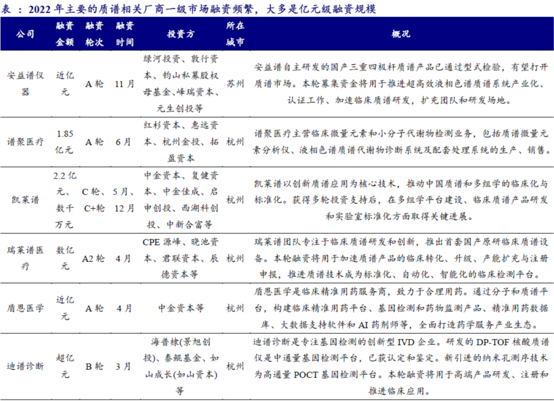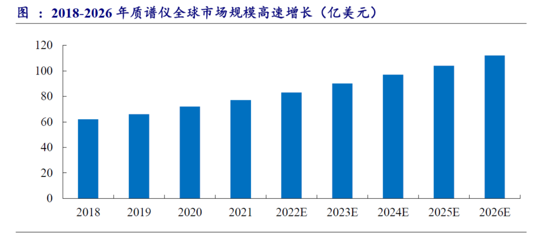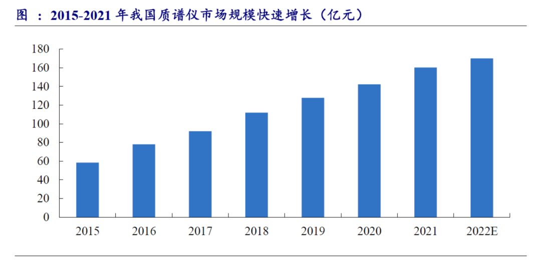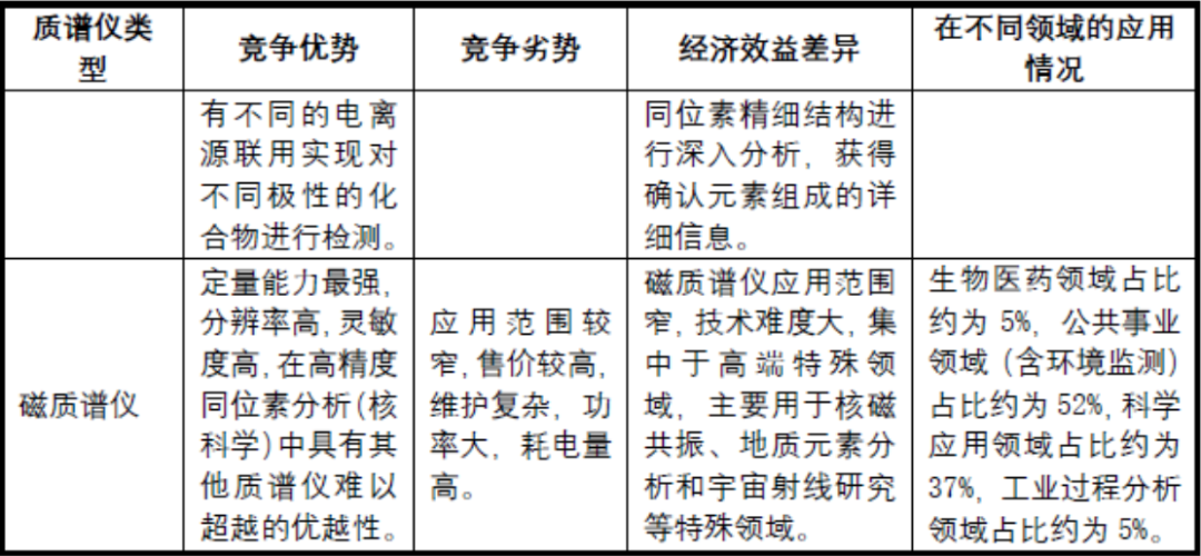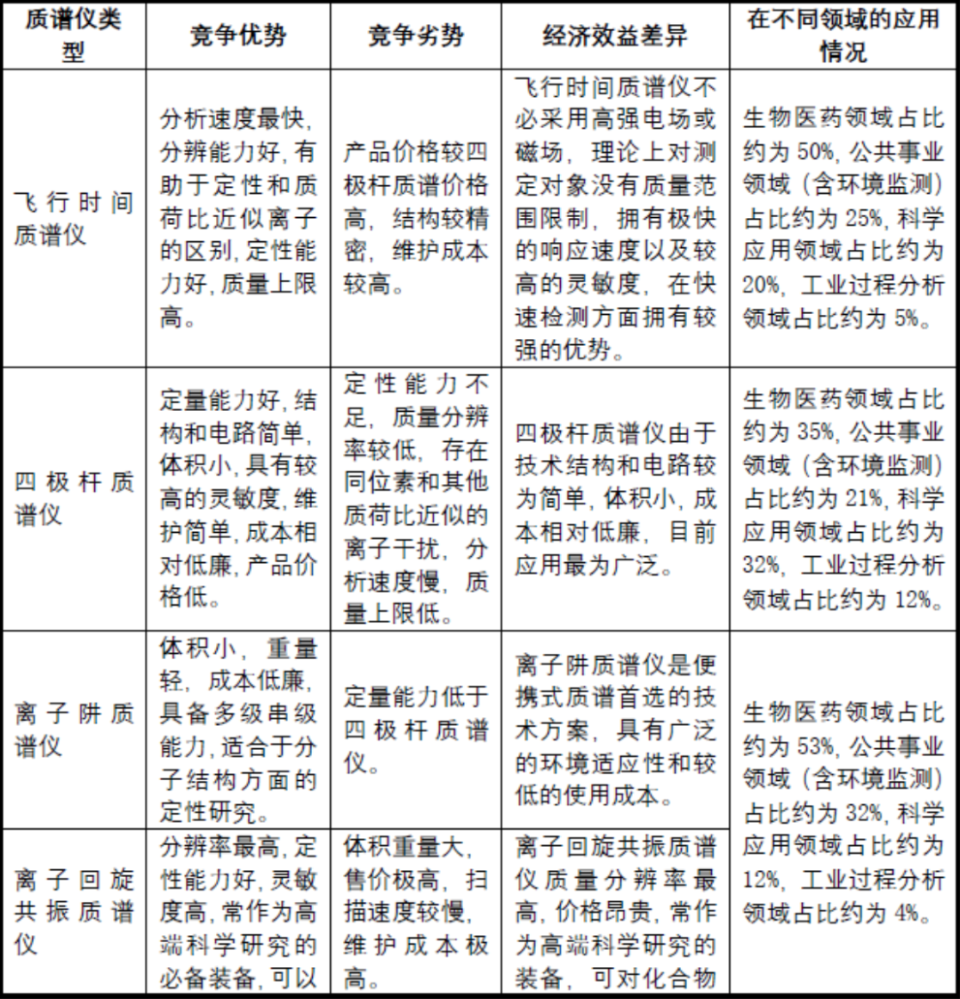2016 年,在通过出口许可证方式实现的美国对中国出口商品中,“用于制造半导体器件或材料的设备”、“压力传感器”、“化学制造设备”与“质谱仪”等产品位居前四名。如后续美国对我国高科技出口管制措施进一步升级,我国从美国进口质谱仪产品尤其是高端质谱仪产品将会受到较大影响。 也即,质谱仪“卡脖子”的地位仅次于“光刻机”,估计很多人都想不到!!! 实际上,2021 年,全球质谱仪市场规模达77 亿美元,2018-2026 年全球质谱仪市场规模年均复合增长率将达7.70%,至2026 年全球市场将增至112 亿美元,且在下游应用领域需求的拉动下,全球质谱仪市场将持续稳健增长。 目前,全球质谱仪市场主要被国际行业巨头占据,全球质谱仪市场的主要参与者为沃特世、丹纳赫、布鲁克、安捷伦、赛默飞、生物梅里埃、岛津等公司,大约占据全球了 90%的市场份额。 质谱仪面临着极大的产业链断供的压力,而这一行业又有哪些核心玩家? 一二级市场又有哪些公司备受资本的关注呢? 一、质谱仪行业的基本概念 质谱仪是通过测量带电粒子的质量进而对物质进行定性和定量分析的高端分析仪器。通俗来讲质谱仪属于一种“灵敏度极高的天平”,可以直接称量物质的原子量、分子量,质谱仪主要结构如下图所示: 来源:禾信仪器招股书、高禾投资研究中心 质谱技术具有高灵敏度、高分辨率、分析速度快等优势,融合电子离子光学、物理化学等学科,涉及精密电子、精密机械、真空、软件、自动控制等技术,在医疗健康、食品安全、环境监测、工业过程分析等领域具有不可替代的作用和举足轻重的地位。 根据《质谱仪通用规范》(标准号:GB/T33864-2017),质谱仪根据核心部件质量分析器的不同,可以分为飞行时间质谱仪、四极杆质谱仪、离子阱质谱仪、离子回旋共振质谱仪、磁质谱仪等类型。各类型质谱仪的对比情况如下: 来源:SDI 、高禾投资研究中心 质谱仪定性可进行化合物结构的确定,定量可检测化合物的组成,是目前物质鉴定最有力的科学仪器之一。中国工程院院士谭久彬在《建设世界仪器强国的使命与任务》一文中指出:建设世界科技强国,首先必须建设世界仪器强国。截至 2017 年,诺贝尔物理学奖、化学奖、生理学或医学奖获奖项目总数为 371 项,获奖总人数为 594 人;直接因测量科学研究成果或直接发明新原理仪器而获奖的 项目总数为 42 项(占 11.30%),总人数为 64 人(占 10.80%),如电子显微镜、 质谱仪、CT 断层扫描仪、扫描隧道显微镜、超分辨荧光显微镜、冷冻电镜、激光干涉仪等;同时,72%的物理学奖、81%的化学奖、95%的生理学或医学奖都是借助于相关尖端仪器完成的。 二、质谱仪行业的蛋糕有多大? 近年来,随着世界各国对生命科学研究、环境保护领域的政府投入不断加大,对医疗健康的研发投入不断提升,以及人们对食品安全问题的日益关注,对复杂物质的精确分析需求日益增长。由于质谱技术具有直接测量物质的基本化学属性,以及高分辨、高灵敏、高通量和高准确度的特性,各类质谱仪在医疗健康、食品安全、环境监测、工业过程分析等领域拥有广阔的市场前景。 (1)全球质谱仪市场发展概况及未来发展趋势 进入 21 世纪以来,许多西方发达国家纷纷制订发展计划并加大扶持力度,力图占据质谱技术领域的领先地位。 美国能源部于 2003 年发布了《未来二十年重大科学装备计划》,作为全球首个宽范围、跨学科的科学装备计划,该计划为重大科学仪器设备、设施和装备提供了战略框架和发展思路,并为后续政策与资助决策提供指导方针。美国主要通过国家科学基金会和美国国立卫生研究院基金扶持各大公司对科学仪器的研发,国家科学基金会为大型科研仪器设备的建造和购置设立了大型科研设备及设施专项资金账户,给予稳定资金支持。此外,美国政府对分析仪器产业实施各种间接的行业扶持政策,鼓励各大仪器公司与大学合作,不断加大研发投入力度。 日本于 2002 年制订了高精密科学仪器振兴计划,将科学仪器创新作为国家发展战略,并从 2004 年起重点投入研发世界尖端分析计算测量仪器。同时,日本政府规定,购买国产仪器可享受免税优惠,以此支持重大科学仪器发展。 近年来,全球质谱仪市场规模高速增长。由于其高灵敏度等显著优势,质谱分析已广泛应用于医疗健康和药物分析等领域,因此质谱仪的需求量迅速增长。根据观研天下的统计数据,2021 年,全球质谱仪市场规模达77 亿美元,2018-2026 年全球质谱仪市场规模年均复合增长率将达7.70%,至2026 年全球市场将增至112 亿美元,且在下游应用领域需求的拉动下,全球质谱仪市场将持续稳健增长。 来源:观研天下、开源证券和高禾投资研究中心 根据 SDI 统计,目前,全球质谱仪市场主要被国际行业巨头占据,全球质谱仪市场的主要参与者为沃特世、丹纳赫、布鲁克、安捷伦、赛默飞、生物梅里埃、岛津等公司,大约占据全球了 90%的市场份额。从全球市场来看,目前质谱仪的销售主要集中于欧美地区,其中北美地区占据了全球质谱仪市场的主导地位,美国是全球最大的质谱仪销售市场,英国、法国、德国占据了欧洲地区质谱仪市场的主要份额。未来随着中国、印度等亚洲国家经济的不断发展,亚洲各国对高端质谱仪的需求也会不断提高,预计亚洲在未来会成为全球质谱仪市场中增速最快的地区,而中国预计