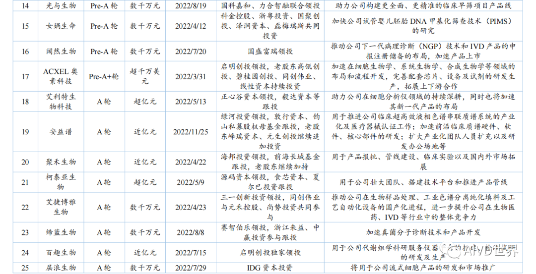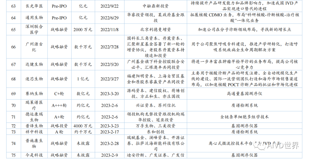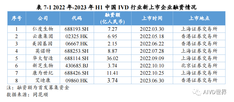 | 体外诊断试剂(In vitro diagnosis,IVD)是指按医疗器械管理的体外诊断试剂,包括在疾病的预测、预防、诊断、治疗监测、预后观察和健康状态评价的过程中,用于人体样本体外检测的试剂、试剂盒、校准品、质控品等产品。按照检测原理和应用领域,可分为生化诊断、免疫诊断、分子诊断、血液诊断、微生物诊断和即时检测(Point-of-Care Testing,POCT)。Kalorama information 数据显示,2022 年新冠检测相关市场份额降低至 25.58%,但全球 IVD 整体市场容量从2021年的 1233.68 亿美元增长至1273.80 亿美元,增速为 3.25%。随着疫情影响消退,新冠检测相关的市场将持续缩减,但整体 IVD 市场受癌症检测、血糖检测等项目的带动仍将保持增长,预计至 2027 年将超过 1400 亿美元。此外,越南、土耳其、韩国、阿联酋、沙特阿拉伯、中国等新兴市场将持续助力全球 IVD 市场的发展。截至2023年H1,2022年-2023 年 H1 共有 8 家 IVD 企业上市,其中2022年上市企业数为 7 家,2023年H1上市企业数为1家。2022年与2021年相比减少10家企业。上述 8 家企业的融资情况如下表所示。由上表可知,2022 年中国新上市的 IVD 企业共计 7 家,分别为仁度生物,云康集团、美因基因、英诺特、华大智造、新芝生物及康为世纪。其中,云康集团,美因基因于港交所成功上市。上述7家企业的IPO融资金额共计76.41亿人民币,其中,华大智造融资额最高,约36亿人民币。2023年H1中国新上市的IVD企业仅艾迪康1家,融资额为3.74 亿人民币。除艾迪康外,致善生物、联川生物、中翰盛泰生物、雅睿生物、硕华生命科学均在2023年H1阶段上市失败(8月7日,荣盛生物IPO终止)。此外,还有一大批 IVD 企业还在审核中,如全式金、世和基因、凯实生物、达科为、沃文特、英科新创等。注:由于某些融资事件未披露原因,本章节 IVD 企业融资事件为代表性企业主要融资事件,非完全统计。2022年中国经历了疫情反复影响,并于年底施行放开政策。与2021年相比,2022年中国 IVD行业整体融资金额出现大幅下降,约为103 亿元[3]。2023年 H1 中国IVD行业融资金额约为20亿元。2022年-2023年H1中国IVD行业一级市场代表性企业的融资情况如下表所示。由上表可知,2022年-2023年H1中国IVD行业一级市场融资主要涉及分子诊断、免疫诊断、质谱检测、生化检测等领域。在上述 96 项投资事件中,共涉及 87 家企业。其中,获亿元以上融资的事件共计 44 项,涉及 41 家企业,按年份统计,2022年获亿元以上融资的事件共计 34 项,2023 年 H1 获亿元以上融资的事件 10 项,明显少于 2022 年度融资金额。齐碳科技完成 7 亿元 C 轮融资,硅基仿生同年获得 2 次 5亿元及以上融资,9 家企业获得数亿元(以 5 亿元统计)融资。2022年-2023年H1中国IVD行业各轮次融资情况如下表所示。由上表可知,2022 年中国IVD行业一级市场融资总额为 103.04 亿元。从融资企业所处轮次看,处于B轮之前的事件约占 58%。在融资额度方面,B/B+轮融资金额最高,为31.55 亿元;其次为 Pre A/A/A+轮,为30.30亿元。由上表可知,2023年H1中国IVD行业一级市场融资总额为20亿元。从融资企业所处轮次看,处于B轮之前的事件约占46%。在融资额度方面,Pre A/A/A+轮融资金额最高,为 9.60 亿元;战略融资事件多未披露金额。2022年全球IVD整体市场容量增速放缓,市场规模较2021年增幅 3.25%。随着疫情影响消退,癌症检测、血糖检测等项目将带动整体市场保持增长,预计至 2027年全球IVD市场将超过1400亿美元,以中国为代表的新兴市场也将持续提供助力。在二级市场融资方面,由于核酸检测业务曾经一度火热,2021 年中国新上市的IVD企业数量为 17家;到2022年中国新上市的IVD企业数量显著降低,仅有7家,分别为仁度生物、云康集团、美因基因、英诺特、华大智造、新芝生物及康为世纪;而2023年H1 仅有1家 IVD企业上市成功。2022 年-2023年H1 8家IVD企业的IPO融资金额共计80.15亿元人民币,其中,华大智造融资额最高,约36亿人民币。在一级市场融资方面,2022年中国 IVD 行业整体投融资力度减弱,投资总额约103 亿元(较2021年的140亿下降26%)。而这一变化在2023年H1呈现的更为明显,上半年中国 IVD行业投融资约为20亿元,仅为2022年度的20%,投资市场降温明显,并且IVD赛道融资有多样化趋势,如微流控芯片、生物原料、生物组学、超低温冷藏设备等。在超亿元的投资事件中, 2022年获亿元以上融资的事件共计34项,2023年H1获亿元以上融资的事件10项,对于大额投资,投资机构更趋于谨慎。齐碳科技完成 7 亿元 C 轮融资,硅基仿生同年获得 2 次 5 亿元及以上融资,9 家企业获得数亿元(以5亿元统计)融资。 [1]《体外诊断试剂注册管理办法(试行)》 [2] 简 析 《 全 球 体 外 诊 断 检 测 市 场 》 第 15 版 (https://new.qq.com/rain/a/20221109A0103C00) [3] 国创联行:2022 中国医疗器械领域融资达 638 次融资总额为 268.9 亿元 (https://business.sohu.com/a/654126512_121124566) |