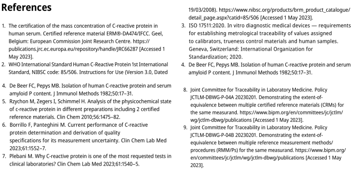 CCLM 2023;61(9):1558-1560 实施C-反应蛋白检测计量溯源性:JCTLM工作组的共识总结 摘 要 检验医学溯源性联合委员会(JCTLM)近期列出了二级可互换有证参考物质(CRM)ERM DA-474/IFCC(DA-474)“人血清C-反应蛋白”,和两个通用的免疫检测为基础的方法原理,作为医学实验室使用的终端用户检测程序对C-反应蛋白(CRP)检测的计量溯源性的基础。近期计量溯源性,在不同的终端用户检测程序间对临床样品检测,已经产生了良好一致性结果。新的较高等级纯物质和二级可互换CRM已经被JCTLM列入提名。但是,这些新候选CRM的数据支持性能,包括依据候选的参考检测程序(RMP)的新的质谱方法,引入这些新CRM对现有计量溯源性到DA-474有影响。血清或血浆中临床上关联的CRP被测量,是一个相同亚单位的五聚体,为应用较高等级CRM和RMP添加了复杂性。JCTLM 在2022年召集工作组,审核相应实施CRP检测的计量溯源性。工作组的共识是,等同数据的程度,在它预期目的为现有终端用户检测系统的校准等级时,必须包括考虑新CRM的影响;一个新的RMP必须与另一个现有的明确认可的候选RMP、或具有全球可用的终端用户检测系统进行比较的结果。 JCTLM保留的数据库,近期列出了二级可互换有证参考物质(CRM)ERM DA-474/IFCC (DA-474) “人血清C-反应蛋白”,和两个通用免疫检测为基础的方法原理(免疫透射和免疫散射),作为实施C-反应蛋白(CRP)检测计量溯源性的基础。DA-474认可报告说明,它的值是由6个市售免疫检测程序产品设定,每一个均使用了ERM DA-470为校准品[1]。 对ERM-DA-470设定的值可溯源到CRP的1st 国际标准,这是WHO的WHO 85/506, 叙述在证书报告中。该WHO 85/506标准在1985年制备,每个安瓿内含有冷冻干燥后溶液的人CRP为50 μg(在0.5 ml健康个体的混合人血清内)[2]。制备的一级校准品作为WHO 85/506的溶液,与临床样品的互换性不清楚。 近期可用的市售终端用户免疫检测产品的校准等级,是依据DA-474二级可互换CRP或使用它的前身ERM DA-472/IFCC,用作较高等级计量溯源性的参考,遵循ISO 17511[3]。用于产生CRM的ERM系列,说明CRP是五聚体形式[4,5]。近期,CRP免疫检测的计量溯源性,已经被一个代表性个数的终端用户检测程序检测的临床样品结果间,产生了临床上拟合目的的一致性[6]。两个二级可互换CRM已经保持了这个持续的良好性能15年了。 从计量溯源性观点上,要求的目标是具有一个校准等级,包括一个一级纯物质CRM,和一个为该被测量的较高等级参考检测程序(RMP),可在很长时间区间内,并在全球的任何地方,能够持续可反复的计量溯源性。形成这些较高等级参考对CRP是一个挑战,因为在临床血液样品中CRP的循环形式,它是一个复杂蛋白,表现为等同亚单位的五聚体 [7]。所以,临床上关联的被测量是血液中血清或血浆中的五聚体CRP,在医学实验室使用的终端用户免疫检测产品,,被指定去优先检测五聚体,不与单体反应。 CRP被测量的复杂性,意即为CRP形成较高等级RMP,必须相应地检测该五聚体的被测量,以拟合免疫检测中校准等级的目的。依据质谱的较高等级RMP,消化了被测量成为多肽碎片,去检测某个量(多肽);与临床样品或二级CRM内,如DA-474内存在的量(五聚体蛋白)不同;在使用免疫检测中,DA-474与临床样品是可互换的。如果单体的比例与用作RMP的校准品,和被RMP检测的样品不同,在这个情况下,一个二级可互换CRM,被测量值被设定到CRM将是不正确的,将在市售可用的免疫产品的校准等级中,引入偏移。 因此,一个一级纯物质CRM的五聚体到单体比率,作为CRP用于校准被测量的一个RMP,是一级CRM和候选RMP的适用性的关键。一个一级CRM必须是五聚体,它的预期用途是为免疫检测制备二级可互换的校准品。否则,一级CRM的设定值,将不正确地反映五聚体形式。另外,在以一级CRM去制备一级校准品中,五聚体结构必须被完整保存。所以,一个一级CRM的完整特性和它用于制备一级校准品,去实施CRP检测的溯源性,必须明白地叙述,以展现它为它的预期用途是适合的和相应的。 JCTLM要求展现等同的程度到一个现有的CRM或RMP,在将一个新的候选CRM或RMP命名,被列入它的数据时[8,9]。对于CRP,近期没有一级CRM或RMP,作为被测量被列入。2022年12月在米兰举行工作组会议时,生效的方针建议,对新的候选RMP与使用医学实验室的现有检测程序进行比较研究,以检查被测量选择性的相似性。但JCTLM方针没有规定一个特定程序,对一个新的候选一级CRM还没有被列入现有清单中的,如何进行比较。但是,对于一个复杂的被测量,如CRP,必须实现考虑单体的影响。 两个国家计量研究院在会议中分享了数据,他们形成了候选的一级纯物质和二级CRM,为CRP以质谱方法为候选RMP。这些CRM的一些,已经被JCTLM审核任命。依据数据说明,以这些任命的CRM校准的程序,检测的临床样品结果,会与使用近期可用的很好一致的终端用户免疫检测,被校准到DA-474或DA472的检测结果有显著差异。这个情况说明对JCTLM审核过程是一个挑战,由于潜在的偏移会引起对病人结果的错误解释。 数据在会上显示的,展现了引入新的候选较高等级参考的风险,所以为终端用户免疫检测产品确定新的校准等级,在与依据现有计量溯源性到WHO 85/506的结果比较中,可引出临床样品结果不一致。医学实验室的实践会被JCTLM列出一个新CRM与较高等级RMP,是一个负面影响,在现有的明确确定的校准等级下引入一个偏移。研讨会总结出,为CRP的一个新的CRM