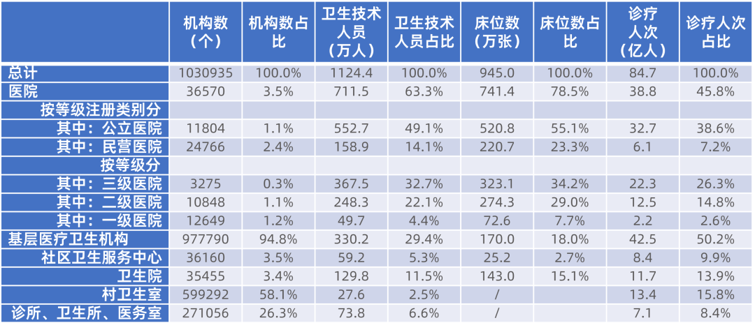 2021年我国诊疗服务概览:医疗机构数量共103.1万个,基层医疗卫生机构97.8万个,其中社区卫生服务中心3.6万个,卫生院3.5万个。