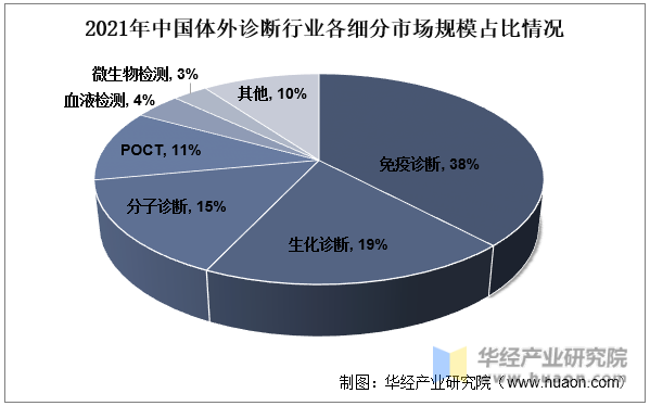 从体外诊断行业市场结构来看,据统计,2021年我国体外诊断行业市场中,占比最高的为免疫诊断,占比达38%,其次为生化诊断和分子诊断,占比分别为19%和15%。