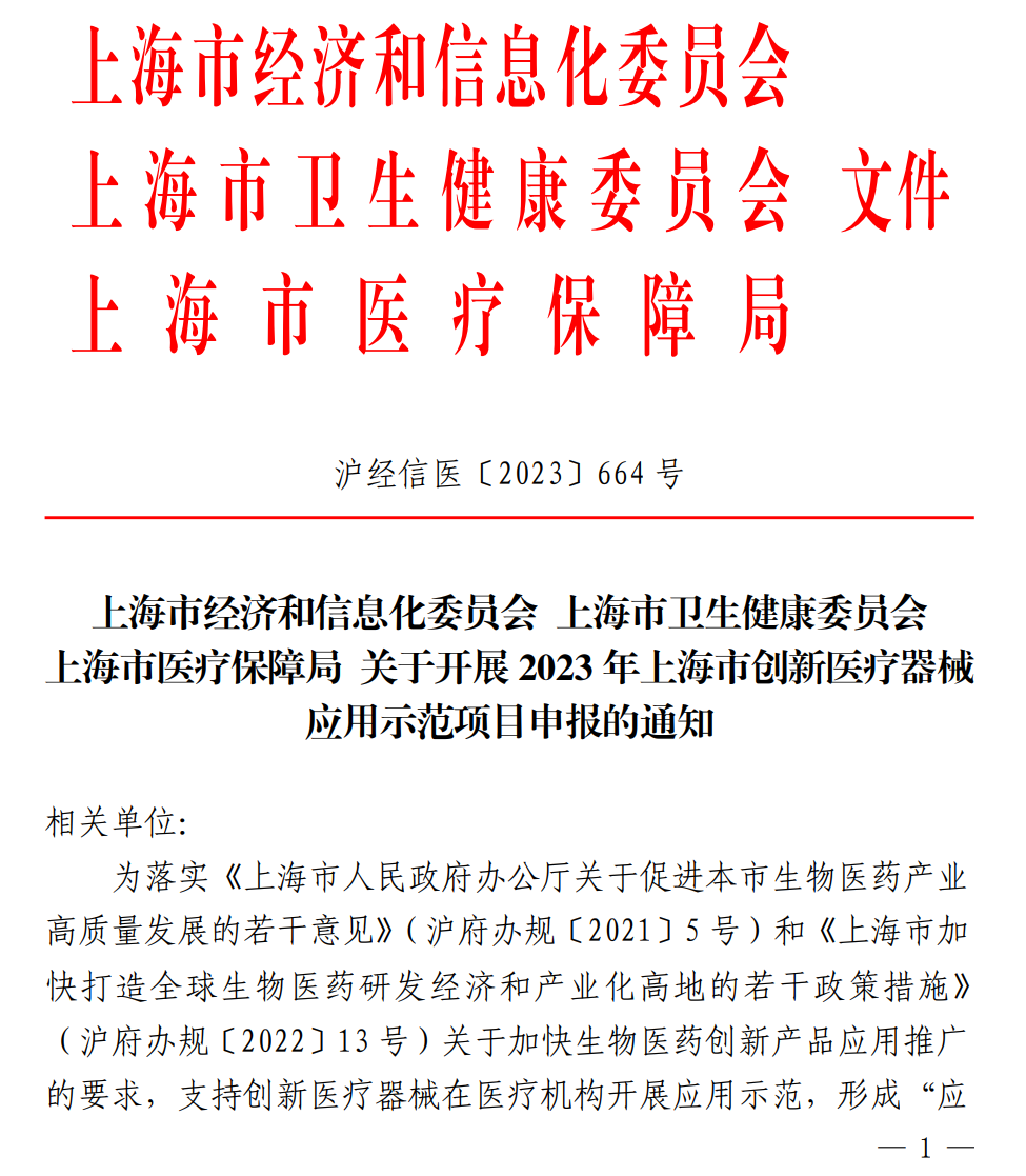 01 10类医疗器械,开展创新器械项目申报 近日,上海市经信委发布《上海市经济和信息化委员会 上海市卫生健康委员会 上海市医疗保障局 关于开展2023年上海市创新医疗器械应用示范项目申报的通知》(以下简称《通知》)。根据《通知》,为加快生物医药创新产品应用推广,支持创新医疗器械在医疗机构开展应用示范,形成“应用示范-反馈改进-水平提升-辐射推广”的创新迭代,提高上海市创新医疗器械性能质量,推动产业高质量发展,现就开展2023年上海市创新医疗器械应用示范项目申报工作。1.植介入器械;2.体外诊断仪器和试剂;3.医用成像器械;4.手术器械;5.治疗器械;6.诊察监护器械;7.康复器械;8.妇产科、辅助生殖器械;9.医用软件;10.其他医疗器械。根据《通知》,由上海市医疗机构与生产企业组成“1+N+1”联合体共同申报,由1家本市医院牵头、N家本市医院/研究单位和1家本市医疗器械企业共同参与。申报2023年上海市创新医疗器械应用示范项目的生产企业、医疗机构、研究单位需要满足一定的条件。例如,申报生产企业须为“本市注册的企业,有固定的生产和研发场地,有专职核心研发团队”,还要“企业持有项目涉及医疗器械的注册证和生产许可证,且注册证持有人与申报企业一致”。(2)产品主要工作原理或者作用机理创新性较高,具有较高临床应用价值;(3)对纳入《上海市生物医药“新优药械”产品目录》《上海市创新产品推荐目录》的产品予以优先支持。 配套支持方面,《通知》明确,对于列入应用示范项目的创新医疗器械、参与示范项目的单位,在申报高质量发展专项、申请配置相关设施设备、申请相关收费项目和纳入医保支付时予以优先支持。在国家或本市重点项目推介、金融支持、对外合作、宣传推广等方面予以优先支持。上述应用示范项目主要研究内容包含(根据实际情况可设置、划分子项目任务):1.对标先进同类产品,开展临床应用数据收集与对比评价,对功能、性能、可靠性、可用性、临床应用效果、经济性等进行临床验证;2.加快实施创新医疗器械在医疗机构内临床应用,结合各自领域研究建立产品使用规范、评价指标体系;3.医疗机构提出改进建议,生产企业改进提升医疗器械质量性能并提高服务水平;4.开展使用人员培训,培养专业技术人才队伍;5.形成产医融合创新成果,加快创新医疗器械推广应用。02 耗材集采全面扩围至今,较为成熟的存量市场逐一遭遇大砍价,一定程度上也倒逼企业加速创新,以更高的临床价值和优质产品换取时间窗口和议价空间。而创新医疗器械的应用推广还需支持。现如今,政策东风正在吹来。今年以来,上海市已接连发布多个文件,明确支持创新医疗器械发展。7月28日,上海市医保局、上海市经信委、上海市科学技术委员会、 上海市卫健委、上海市地方金融监督管理局 、国家金融监督管理总局上海监管局、上海市大数据中心等七部门联合发布《上海市进一步完善多元支付机制支持创新药械发展的若干措施》。《措施》提出,优化新项目试行期内医疗机构自主定价机制,鼓励医疗机构加快应用。完善临床新项目备案应用机制,对首次临床应用的新项目准予收费立项后,其他医院备案后即可收费。 要加快创新药械临床应用。调整优化医疗机构考核机制,医院不得以用药目录数量、“药/耗占比”等原因限制创新药械入院。 此外,加大创新药械医保支付支持。在DRG/DIP支付方面对创新药械予以倾斜,提高新技术应用病例支付标准,新技术应用高倍率病例不设控制比例,成规模新技术应用可独立成组。稳步扩大本市医疗服务项目和医用耗材医保支付范围,优先覆盖创新药械。7月10日,上海市医保局发布《上海市医用耗材纳入医保支付范围的工作规范(试行)》,其中明确,逐步将临床价值高、经济性评价优良的医用耗材纳入医保支付范围,用高质量的医疗保障水平,满足群众对新技术、新耗材的高品质医疗需求。此外,北京市医保局2022年发布的《关于进一步完善本市新增医疗服务项目价格管理工作的通知(暂行)》中规定,属于科技重大专项、重点研发计划及创新医疗器械的产品,具有自主知识产权的创新成果转化为诊疗服务的项目,医疗机构可不受试行期限制,及时向市医保局提出优先纳入统一定价和医保支付政策评估论证程序的书面申请。北京市医保局还在《关于印发CHS-DRG付费新药新技术除外支付管理办法的通知(试行)》中明确,决定试行CHS-DRG付费新药新技术除外支付管理办法。创新医疗器械审批也在提速。在国新办7月5日举行的新闻发布会上,国家药品监督管理局局长焦红指出,通过这些年药品、医疗器械产品的受理量、审批量,包括今年上半年的受理量和审评量,就能够明显看出我国的药品医疗器械创新成果已经进入了爆发期。国家药品监督管理局副局长徐景和谈到,下一步,国家药监局将持续跟踪医疗器械创新发展的新情况新进展,不断总结新经验、探索新规律、推出新举措,批准更多更好地创新高端医疗器械上市。根据国家药监局最新数据,截至目前,国家药监局已批准228款创新医疗器械上市。国产创新医疗器械正在加速爬坡,创新竞赛还将持续上演。