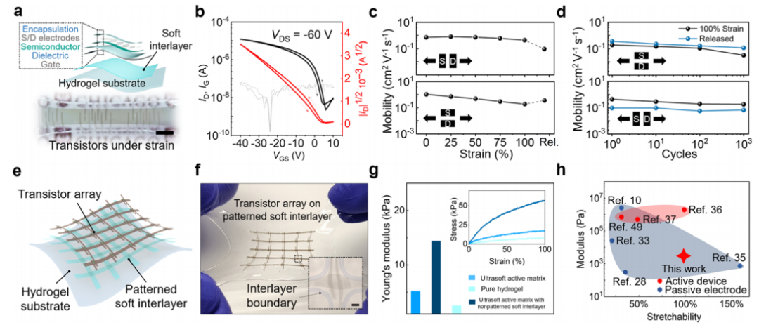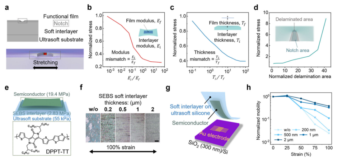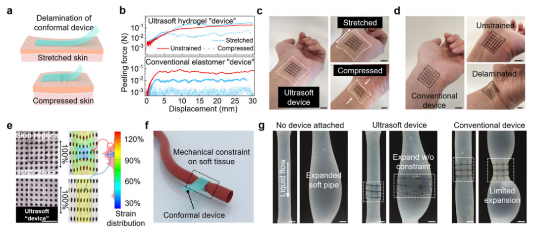 将电子设备作为可穿戴或植入式设备与人体相连接,为健康监测、疾病治疗甚至基础生物学研究提供了大量功能。为了实现无缝和贴合的接口,必须尽量减少电子设备与人体皮肤/组织之间的机械不匹配,其中两个主要方面是柔性(即杨氏模量)和可拉伸性。虽然可拉伸性的实现通常伴随着杨氏模量的降低,但这些可拉伸电子材料和器件的模量仍然比大多数柔性生物组织高3-4个数量级。进一步减少这种模量不匹配对于实现长期稳定的生物界面是非常重要的。首先,机械方面,理论和实验都表明,组织级模量可以显著提高可拉伸装置在非零高斯表面(如人体皮肤或组织)上的贴合性。其次,免疫方面,生物植入物的组织柔软度可以显著抑制对可植入装置的异物反应(FBR) 。总的来说,一个贴合且无疤痕的组织界面对于和调节信号转导的保真度非常重要。 近日,一组来自芝加哥大学和UCLA的研究团队在杂志Nature Communications上发表了一篇题为“Achieving tissue-level softness on stretchable electronics through a generalizable soft interlayer design”的文章。在这项工作中,作者报告了一种可推广的柔性中间层设计,当将其添加到功能层和基底之间时,可以允许使用现有的可拉伸电子材料来构建组织级模量器件,同时实现高拉伸性。利用这种设计,作者展示了一种基于PAAm水凝胶衬底的可拉伸晶体管阵列,其有效杨氏模量为5.2 kPa,比传统的器件软两到三个数量级,可以与动态软表面(如具有非零高斯纹理的皮肤)形成更舒适、稳定和不易察觉的接触。 图片来源:Nature Communications 柔性中间层设计的工作机理 作者通过对由功能薄膜、柔性中间层和超软基底组成的三层结构进行有限元分析(FEA),从理论上研究了中间层的力学功能。在功能膜中引入一个切口,并绘制缺口周围的应力水平图(图a)。结果显示,切口周围的模量越高、夹层厚度越大、分层程度越轻(即粘连性越好),都可以抑制功能层的应力集中(图b-d)。 研究团队通过实验验证了SEBS H1052 (2.83 MPa)可以作为理想的中间层,与超低模量基材(例如水凝胶)具有强粘附性。采用这种中间层设计,即使只有200 nm厚的SEBS中间层,100%应变下半导体薄膜中的拉伸裂纹尺寸和密度明显减小,进一步将SEBS层增加到2 μm有助于实现更少的裂纹扩展(图f)。半导体薄膜的载流子迁移率的变化趋势(图h)也反映了这种SEBS中间层显著提高的拉伸性。 柔性中间层显著提高功能层可拉伸性。 图片来源:Nature Communications 采用柔性中间层设计的超软晶体管 作者尝试使用柔性中间层设计在可拉伸晶体管上实现类似组织的柔软性。采用PAAm水凝胶(200μm,模量2.58 kPa)作为基底,以及SEBS作为柔性中间层,得到的晶体管厚度为200μm,杨氏模量低至14.4 kPa。两个方向的100%应变下,即使重复拉伸1000次,柔性中间层的高拉伸性也能确保稳定的载流子迁移率(图c,d)。 通过在SEBS软中间层上预先设计空间图案有助于有源矩阵实现更低模量,可低至5.2 kPa模量(图g),比之前报道的传统弹性体基底(厚度为100 μm)上的可拉伸晶体管阵列软两到三个数量级,同时保持了相似的可拉伸性。 超软可拉伸晶体管和有源矩阵电路采用柔性中间层设计。图片来源:Nature Communications 超软器件增强了贴合性并减少了机械约束 组织级柔软度的实现可以极大地提高附着在动态皮肤/组织表面上的电子设备信号转导质量的同时,降低不适感。贴合性的改善在非零高斯曲面上得到了证明,如图c, d所示的人类手腕表面。超软设备在皮肤变形下可以更好地遵循原始皮肤表面纹理,这意味着更低的不适感和更好的贴合性。 此外,低杨氏模量的装置最大限度地减少了对柔软皮肤和组织运动的机械约束。低机械约束的好处在包裹变形软组织的情况下更为明显,例如周期性膨胀的血管(图f)。与传统器件(图g右)所看到的明显约束相比,当被超软晶体管阵列包裹时,血管可以更好地保持其原始膨胀程度(图g中)。 超软器件增强了贴合性并减少了机械约束。 图片来源:Nature Communications 超软器件的生物相容性表征 对于植入式应用的生物相容性,作者比较了三种类型样品上的FBR:水凝胶膜、SEBS膜和SEBS-水凝胶双层样品。这些样品被植入小鼠皮下1个月,以分析组织反应。如图d所示,双层植入体的瘢痕组织(18.3μm)比SEBS植入体(51μm)薄,与水凝胶植入体(15.4μm)相似。结果表明,长期的免疫相容性确实可以从植入物模量的降低中获益。 研究团队进一步将中间层设计应用于超软可拉伸电生理(EP)记录设备(图e)。该设备的超低模量表现出两个主要优点。首先,该设备与心脏表面保持相对稳定的附着,由于心脏跳动而产生的位置移动最小(图f-top),这对于在心脏表面进行长期空间分辨率的ECG记录/映射非常重要(记录的ECG信号如图g-top)。其次,超软装置对心脏跳动的机械约束较低,LVP稳定且增幅最小(图h)。这种益处对于使用慢性集成设备进行微创和稳定的心脏测绘是很重要的。 Ultrasoft设备具有抑制免疫反应和与活体组织的机械兼容性。图片来源:Nature Communications 总结 作者展示了一种通用的柔性中间层设计,该设计允许具有相对高模量的可拉伸功能材料用于制造超软和可拉伸电子产品。通过实现均匀的应变分布,该设计可以显著提高基底上功能层的可拉伸性,其模量降低了几个数量级。通过将可拉伸半导体集成到超软基底上而不影响可拉伸性,这种中间层设计使模量低于10 kPa可拉