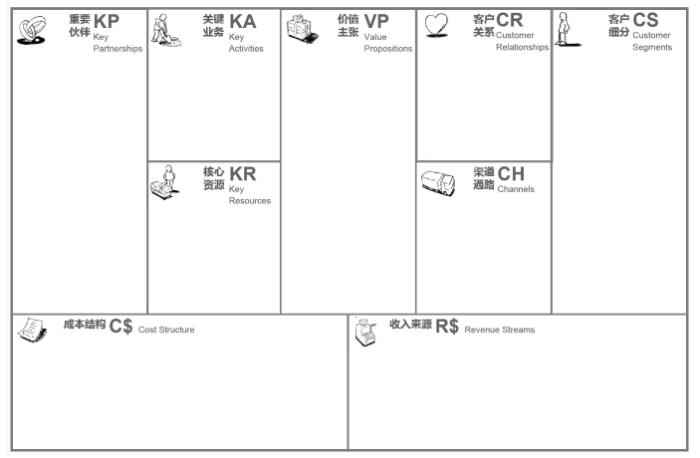 我们专门去查找了一些资料,找到了一个比较实用的工具-亚历山大·奥斯特瓦德 (Alexander Osterwalder) 设计的商业模型画布,把商业模式的构成分为9个部分组成。