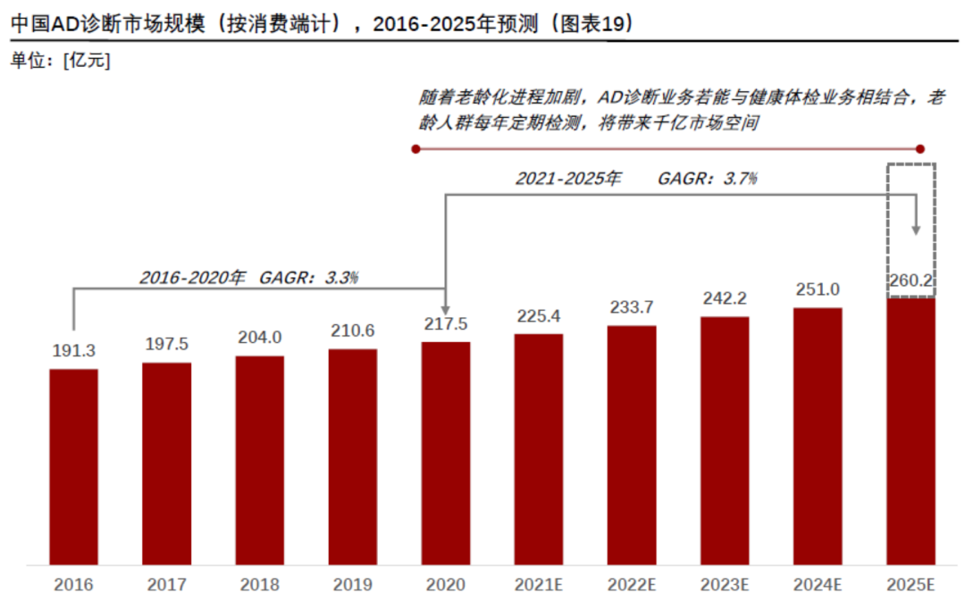 260亿级赛道!国家卫健委发文,国内外上市公司正在加速进入! 随着人口老龄化进程的加快,以阿尔茨海默病为主的老年痴呆疾病发病人数持续增加,严重威胁老年人健康和生命质量,给家庭和社会带来沉重负担。为认真贯彻落实《中共中央 国务院关于加强新时代老龄工作的意见》《健康中国行动(2019—2030年)》有关要求,预防和减缓老年痴呆发生,切实增强老年人的健康获得感,促进健康老龄化,我委决定2023—2025年在全国组织开展老年痴呆防治促进行动。 一、阿尔兹海默症(AD)的基本概念 阿尔兹海默症(AD)是一种神经退行性疾病:AD是最常见的痴呆症的一种,其疾病特征表现为一系列症状,包括记忆力减退和认知障碍(即语言、思维和行为方面的困难)。AD大脑中受损的脑细胞(即神经元)首先从海马体开始,海马体是大脑负责认知功能的部分;然而,研究认为需要 20 年或更长时间才可能会出现疾病症状,并且这些症状会随着时间的推移而恶化。严重的AD可能干扰大多数日常活动,患者可能需要全天候护理。AD的确切发病机制尚不明确,通常认为是老化、遗传和环境多种因素的共同结果,目前有多种学说,其中影响较广的是β类淀粉样蛋白级联假说。 AD病理在组织学水平上的特点是神经元异常引起的脑形态(即收缩)和功能变化(即神经传递干扰)。在分子水平上,最具特征的病理之一是Aβ蛋白(即斑块)异常沉积物的积累和神经纤维缠结(即磷酸化Tau蛋白)的形成,从而导至神经细胞整体退化,并最终干扰神经系统的高级功能。 实际上,AD的确切发病机制尚不明确,通常认为是老化、遗传和环境多种因素的共同结果,目前有多种学说,其中影响较广的是β类淀粉样蛋白级联假说。 来源:招商证券(香港)、世界阿尔茨海默病报告 2011/Alz.org和高禾投资研究中心全球痴呆病例迅速上升,到2050 年预计将达到1.39 亿。AD 主要影响老年人,而目前人口老龄化是前所未有的。根据世界卫生组织的报告,2022 年全球痴呆症病例为 5,500 万(其中约 60-70% 为 AD 病例,达约3,600万例),每年新增近1,000 万例,带来巨大的社会和经济负担(估计2019年花费1.3 万亿美元医护成本 v.s 2030年2.8 万亿美元医护成本)。据估计,全球这一数字每20年翻一番,到2030年达到7,800万,到 2050 年达到1.39亿。 1)在美国,65 岁以上的人中约有九分之一 (~10.7%) 患有 AD, 2022 年约为 650 万例;鉴于美国人口老龄化,预计到 2050 年该年度数量将翻一番1-2。 2)在中国,从最近的一份报告来看,2020 年 60 岁及以上的痴呆症患者约有 1,507 万人,其中 AD 患者约 983 万人,而且这一数字还在迅速上升。在过去的几十年中,流行病学趋势也发生了显着变化。ADRD(AD及相关痴呆)在中国人口死亡的主要原因中排名第 5(与1990 年相比仅排名第10)。 另外,根据弗若斯特沙利文统计,2020年我国共有1,250万AD患者,随着中国人口老龄化,中国AD患者人数正在逐渐增加,预计到2025年,将有1,550万AD患者,2030年进展趋势加速,AD患者将进一步增至1,950万人。根据《中国阿尔茨海默病2022报告》,2019年我国AD年龄标化患病率为788.3/10万人,因AD的死亡顺位在1990年处于第10位,20年后已跃升至第5位,年龄标化死亡率为23.3/10万人。2019年全球AD年龄标化患病率为682.5/10万人,年龄标化死亡率为22.9/10万人。因此无论是患病率还是死亡率,我国均高于全球平均水平。 二、阿尔兹海默症(AD)的检测重要性 AD起病隐匿,临床主要变现为认知障碍、精神行为异常、社会生活功能减退,是一种病情进行性发展的神经退行性疾病。根据患者病情,AD通常分为临床前期、轻度认知障碍(mild cognitive impairment,MCI)、轻度、中度、重度AD,临床确诊时患者通常处于后3个阶段。在临床前期和MCI阶段,虽然患者症状不明显,但生物标志物指标已有异常。 来源:《自然评论-神经病学》、申万宏源和高禾投资研究中心AD的病程是一个不可逆的过程,迄今为止没有有效的治疗药物和手段, 因此与癌症一样, 阿尔兹海默症的治疗关键是早期诊断,并在疾病早期对阿尔兹海默症进行干预和延缓。 然而遗憾的是,AD防治难度高的主要原因恰恰就是早期诊断困难。 目前尚无足够准确的方法能早期筛查和识别阿尔茨海默症,主要诊断方法为联合诊断。对于拟行痴呆诊断的患者,首选进行认知功能评估,同时常规行CT和MRI等影像学检查,当常规方式不能明确时,考虑使用PET或脑脊液/血液生物标志物检测。对于有痴呆家族史或者快速进展型痴呆,应考虑添加基因检测。 AD早期诊断标志物的应用仍处于科研与临床应用的过渡期,尚未有某一种标志物能够单独的作为AD早期诊断标记物。 目前AD早期诊断仍存在一定难度,如标志物的检测缺乏一定的规范和标准、患者缺乏对AD早期的认识和接受度等;但生物标志物在AD早期诊断中意义重大,为疾病早期识别、及时干预争取了有效时间窗,是目前唯一有效延缓AD进展的措施。 目前用于辅助AD 诊断的生物标志物主要分为两大类:体液标志物和影像标志物。 1)神经影像学检查 结构影像学:头部CT(薄层扫描)和MRI(冠状位)检查:可显示脑皮质萎缩,用于排除其他潜在疾病和发现AD的特异性影像学表现。 功能性神经影像:正电子扫描(PET)和单光子发射计算机断层扫描(SPECT):FDG(氟脱氧葡萄糖)-PET用于测量神经元和胶质细胞的葡萄糖消耗;Aβ-PET 提供淀粉样斑块在大脑的分布和含量;Tau-PET主要用于临床药物试验,对于其临床诊断价值仍需进一
