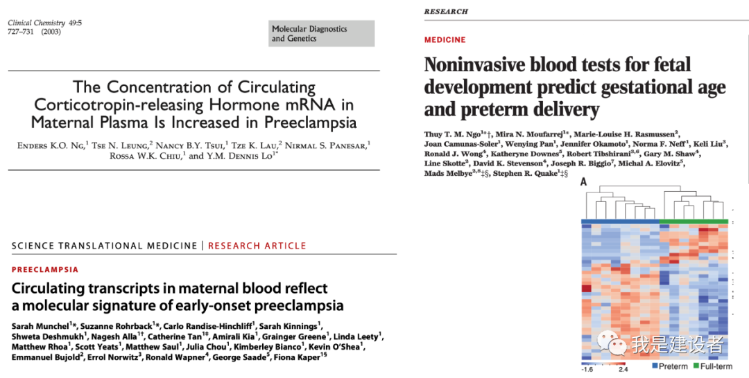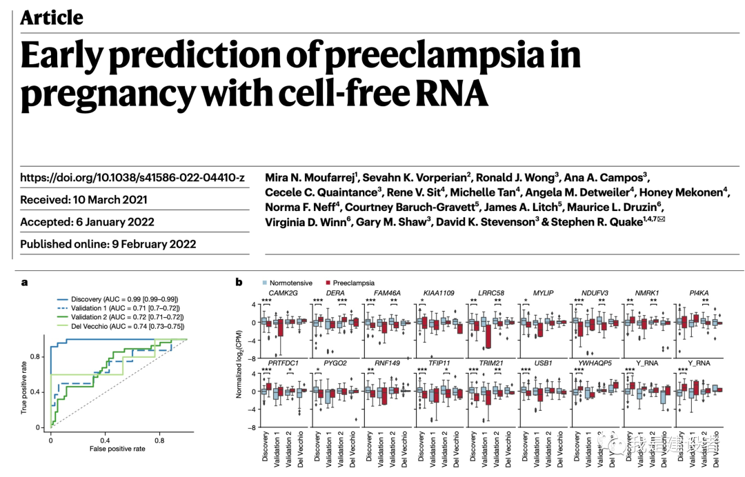 相信开始阅读这篇文章的你应该已经为人父母,或者不久就要当爸爸妈妈,如果说怀孕、诞生小宝宝是一个充满期待的幸福时光,相信你不会反对。 孕育小生命,不管怎么说,都是一段神奇又伟大的人生经历,辛苦甜蜜,各为人知。但妊娠分娩的每个阶段都不轻松,这其中充满了焦虑,因为各种不确定或者不放心。 很多时候,那句稀松平常的“母子平安”是多么来之不易。因为对许多人来说,怀孕会带来严重的健康问题,可能危及父母和孩子。 妊娠并发症及其所带来的风险 从妈妈一个人到怀胎到分娩,身体的结构及生理都发生着巨大的调整和重新适应。妊娠会导至内分泌、激素水平的全身性改变,这也会引起很多并发症,比如先兆子痫、妊娠糖尿病、妊娠高血压等等,也有胎儿早产等让人揪心的问题。 先兆子痫和早产都是相对常见的,一些妈妈们也不陌生,这些疾病可能使母亲和婴儿在出生前和出生后都面临健康的风险。先兆子痫是一种与高血压相关的妊娠特异性疾病。据估计,全球 4.6% 的妊娠会发生先兆子痫。如果不及时治疗,可能会导至癫痫、昏迷和器官损伤等严重问题。而早产指的是妊娠达到28周但是不足37周分娩。根据临床统计,早产大概占分娩总数的5%-15%。虽然宝宝足月生产是一个美好的期待,但随着高龄产妇的增加,早产儿的出生概率也在逐年上升。早产就意味着胎儿的各器官发育还未成熟,存活率及远期智力、神经系统及其他方面的发育都会稍显落后。 一些证据提示,每5个妊娠中就有一个会受到不可预期的并发症的影响,这比女性每年所遭受的所有类型的肿瘤还要多。 为什么是不可预期?因为现实环境里,医生没有一个好的办法来确定一个人是否会出现这些并发症,即便已经有了一些措施,但效果有限,可能也做不到及早的发现,更不用说能精准地判断了。 面对这些不可预期的并发症,除了焦虑还会有恐惧。如果能及早的发现或排除,更有针对性地进行临床管理或者有效的治疗,似乎医生和准父母们都会拍手称赞。 探索潜在的生物标记物,开发精准的妊娠并发症风险预测,既是一个显而易见的未满足的需求,又是一个理想的临床应用场景。 开发血液游离RNA被寄予厚望 自发现母亲血液中游离的胎儿DNA(cfDNA)以来,NIPT无创产前检测的开发和商业化已经彻底改变了胎儿染色体异常诊断和风险筛查的临床管理实践,成为基因测序临床应用的最成功案例。 通过简单采集母亲的一管血来进行产前的健康管理已经越来越多地被临床所采用,不管是针对胎儿染色体异常还是单基因突变,亦或者简单对准父母进行风险基因的携带者筛查,non-invasive无创的方式成为实践的关注点。 回到妊娠的并发症,一个自然生长的想法就是:cfDNA是不是也提供了一些关乎风险的信息呢? 的确有不少课题组在朝这个方向探索。但cfDNA提供的是我们细胞内基因内容的静态视图,即便在血液中的含量有差异,但似乎很难反映动态的变化过程。前面提到,妊娠时一个全身性的动态调整和再适应,这种幅度之大之快,一定包含了细胞及分子层面的调控及响应。事实上,科学界正在朝着cfRNA这条路线加速前进。 但为什么是cfRNA呢? 我们所有人的血液中都携带着自己的遗传物质片段,包括 DNA 和更易消失的RNA。在怀孕期间,这些cfDNA 和cfRNA 的自由漂浮片段都会从发育中的胎儿毛细血管释放,通过胎盘内的绒毛进入到母亲的组织和血液中。与DNA不同,RNA 提供了哪些基因在特定时间点被打开或关闭的快照。由于基因活性随细胞和时间的推移而变化,研究人员意识到可以通过RNA 来更动态地了解怀孕期间母亲体内发生的变化,比如可能的并发症。(题外话,血液里游离的RNA对于肿瘤早筛等液体活检的开发同样有建设意义。) cfRNA从哪里来 cfRNA之于妊娠并发症的研究最早出现在2000年代初期。有趣的是,研究cfDNA、开发NIPT的几个重要参与者也都没有缺席cfRNA的工作。 NIPT之父、香港中文大学的卢煜明教授实验室在2003年就报告说,在对 22 名孕妇进行的一项研究中,在妊娠晚期的孕妇胎盘中发现了一种特定的 RNA 含量要高得多,而且患有先兆子痫的人比没有先兆子痫的要更多。之后,卢教授的实验室对怀孕期间对RNA变化进行了更多的研究,对所发现的cfRNA也申请了相应的专利保护。 在2018年的一项研究中,斯坦福大学生物物理学家 Stephen Quake实验室报告称,cfRNA 可以帮助确定分娩何时发生。他们在美国招募了 38 名已知有早产风险的孕妇,然后在妊娠中期或晚期对每位孕妇抽取了血液样本。通过比较最终早产者和足月分娩者的cfRNA,他们能够识别出临产前两个月出现的一组 RNA,可以帮助查明大约 80% 的早产情况。 这项研究也让其他课题组思考是否可以通过cfRNA来预测先兆子痫。2020年,Illumina与合作者报告了数十种先兆子痫孕妇特有的 RNA 转录本。越来越多的证据提示RNA的表达情况与不同的妊娠结局相关联,这能够帮助在孕早期、在症状出现之前帮助识别有风险的人群吗? 同样是Stephen Quake小组,他们在 2022 年发表了一项研究结果,招募了 73 名先兆子痫风险较高的母亲,并对她们进行了四次抽血:12 周或之前、13 至 20 周、23 周或之后以及胎儿出生后。随后,将 24 名确实患有先兆子痫的女性与其余 49 名未患有先兆子痫的女性的cfRNA 进行了比较,确定了与 544 个基因相对应的 RNA,这些基因的活性在患有先兆子痫的人和未患有先兆子