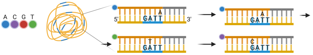 如此继续下去,直到每条模板序列都完全被聚合为双链。这样,统计每轮收集到的荧光信号结果,就可以得知每个模板 DNA 片段的序列。