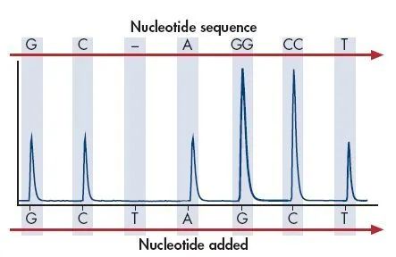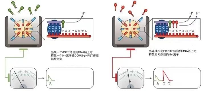 当连续相同的dNTP结合到DNA链上时,则会释放相同数目的H+,传感器上记录的信号也会相应加倍。