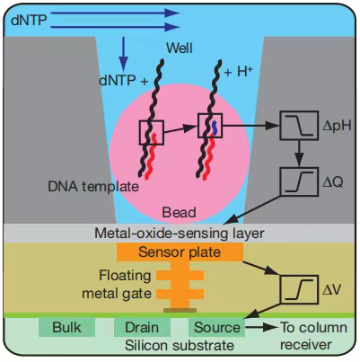 每个小孔只能容纳一个测序珠子,孔底端有pH敏感型晶体管传感器,可检测孔内pH变化并将化学信号转变为数字信息。