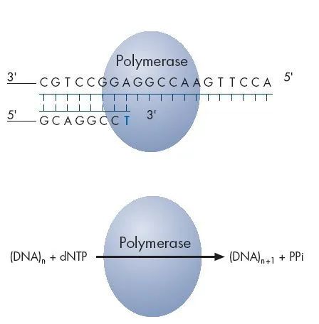 如果它刚好能和DNA模板的下一个碱基配对,则会在DNA聚合酶的作用下,添加到测序引物的3’末端,同时释放出一个分子的焦磷酸(PPi)。