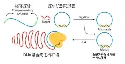 1.  滚环扩增的方法模板必须是环状的,如果针对线性基因进行扩增,就需要锁环探针,锁环探针的两端具有与靶基因的互补序列,通过锁环探针识别靶基因并结合形成不完全闭合环状寡核苷酸.