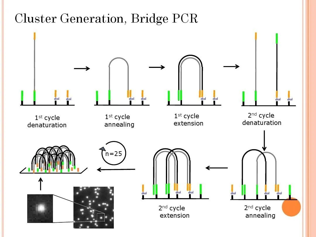 桥式PCR的基本原理:桥式PCR是将DNA片段固定在芯片上,然后进行PCR扩增。
