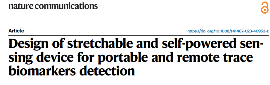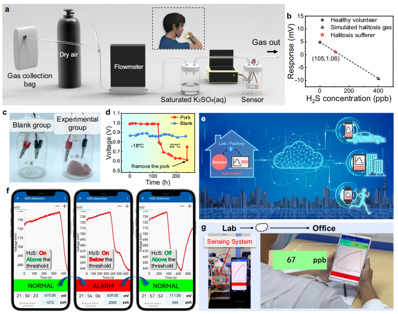 作者提出了一种基于原电池结构的低成本、灵活和自供电的H2S生物标志物传感装置,用于各种应用场景的分析。这种传感机制归因于气体分子在电极表面的化学吸附所引起的电极电位的变化。可拉伸的有机水凝胶被用作固态电解质,以使设备在拉伸变形或各种环境下稳定和长期运行。由此产生的开路传感装置具有高灵敏度,低检测限和对H2S的优良选择性。展示了其在无创口臭诊断和肉类腐败鉴定中的应用,在便携式医疗电子和食品安全领域显示出巨大的商业价值。该公司还开发了一种无线传感系统,用于蓝牙和云技术的远程H2S监测。