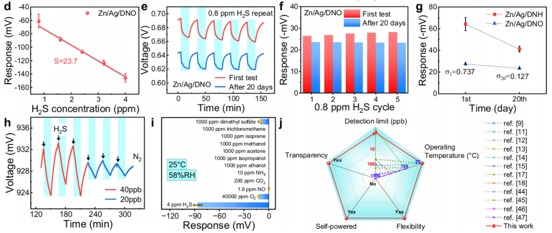 对于三种构建的Zn/Ag/DNO传感器,其对H2S浓度的平均响应曲线如图d所示。响应与H2S浓度之间存在良好的线性关系,且具有良好的再现性。根据相应的线性拟合曲线,确定了Zn/Ag/DNO传感器对H2S的灵敏度为23.7 mV/ppm,充分显示了其检测H2S的能力。此外,研究结果还表明了装置具有良好的重复性和稳定性(下图e,f)。