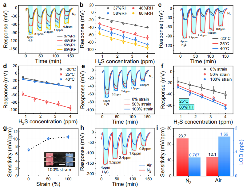该传感器具有高灵敏度(23.7 mV/ppm)、低LOD (0.79 ppb)、优良的选择性、良好的重复性和稳定性。此外,该传感器对干扰具有免疫力,在零下温度、厌氧环境和拉伸变形下仍能保持功能,这与现有的H2S传感器具有很强的竞争力。这项工作为未来低成本、自供电、高性能的可穿戴气体传感器的发展提供了一个开创性的概念和基础。这一重大进展在增强人类健康和安全方面有着巨大的希望,有助于传感器技术领域的不断进步。