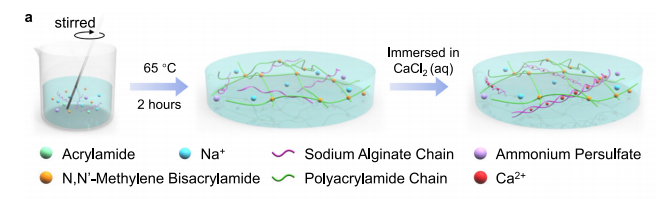 PAM/CA DN水凝胶的制作过程示意图。图片来源:Nature Communications