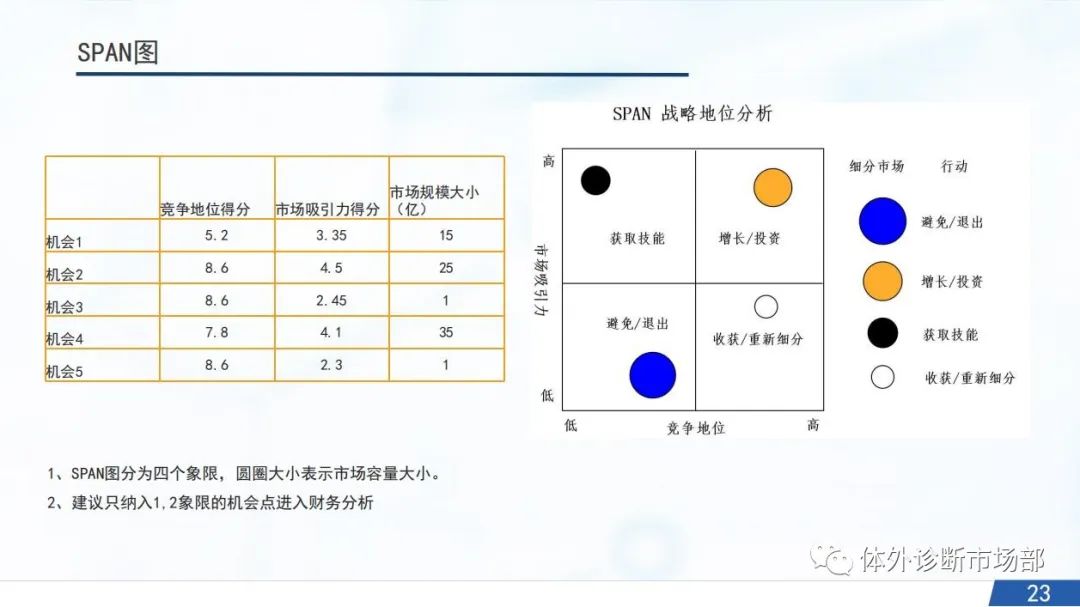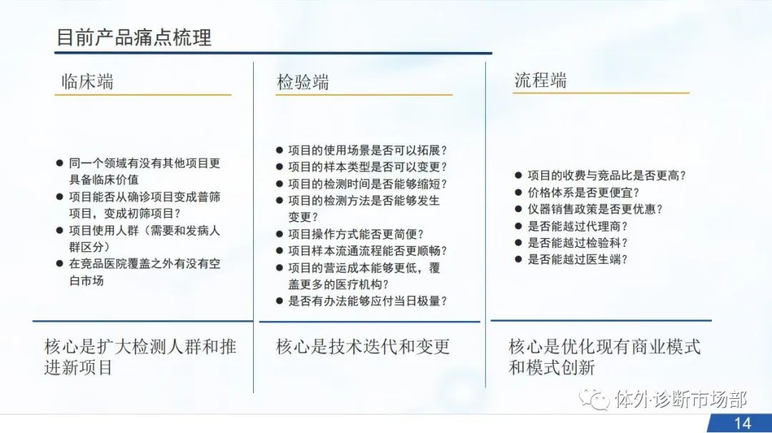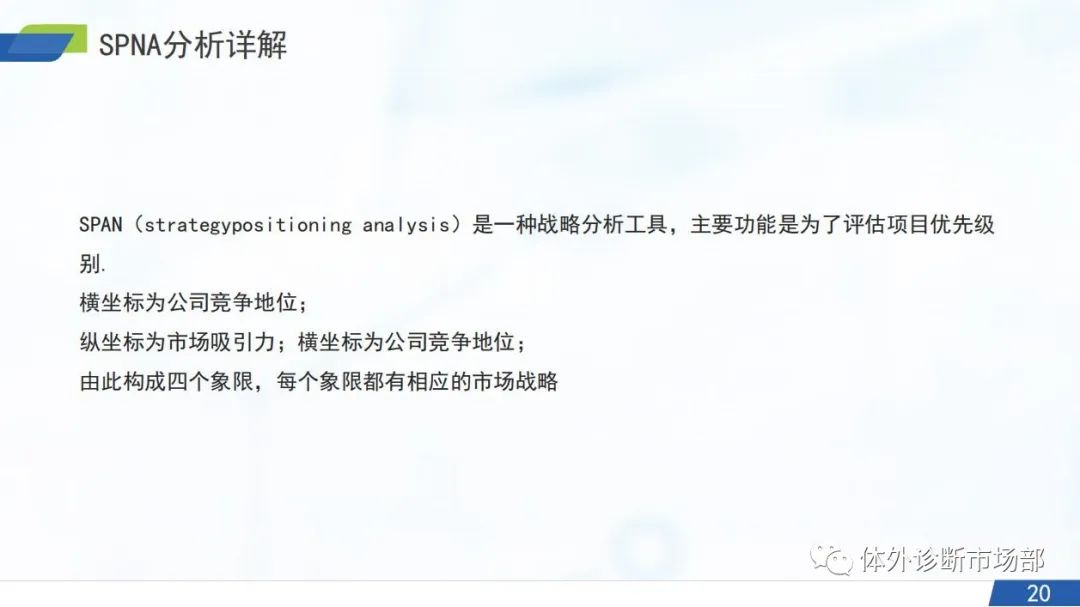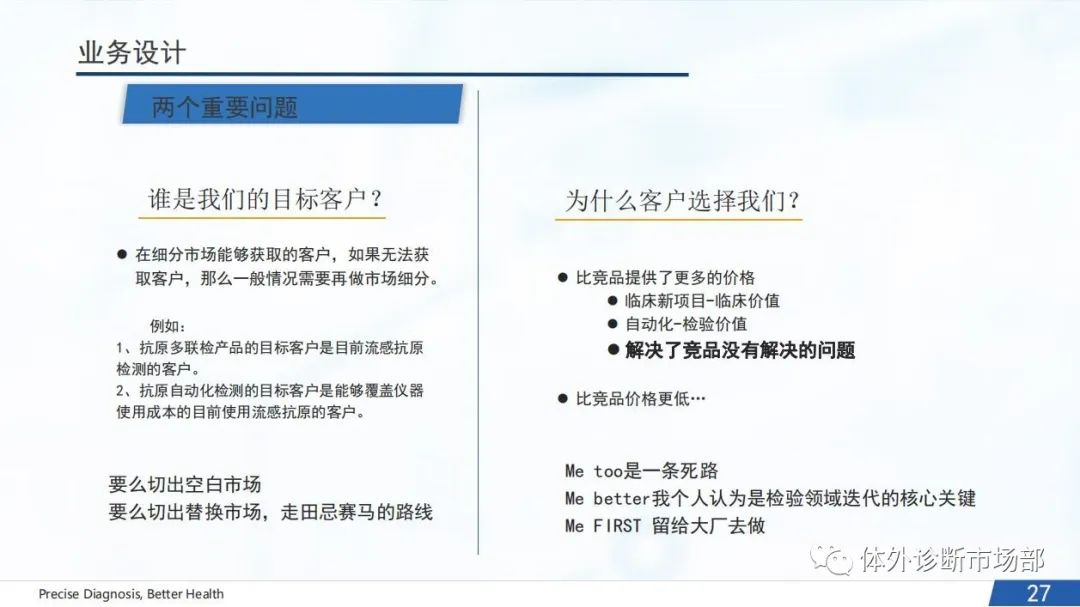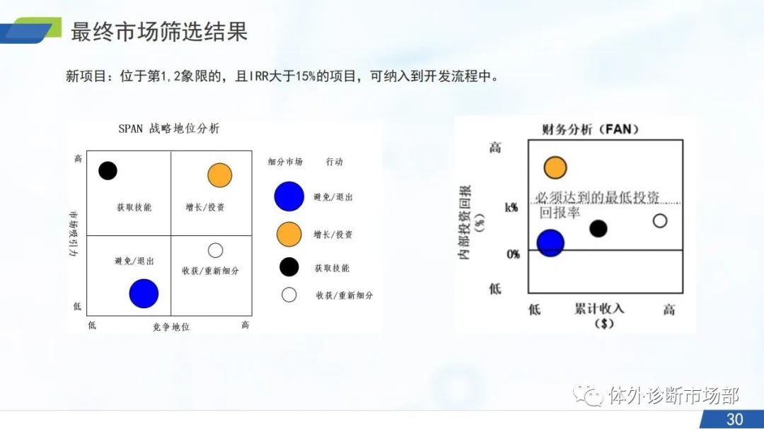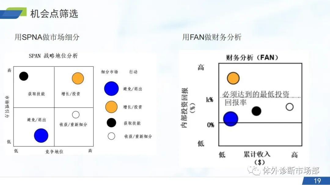 来源:体外诊断市场部,作者:张清华 资深行业产品经理,张清华对擅长的需求定义和产品细分领域进行了分享,深入浅出介绍了需求探索和机会筛选的原则方法。 需求探索:需要细分临床需求和检验需求,并且在产品的价值链中找到机会点,由于IVD领域多数产品的收费是确定的,倒逼产品设计符合成本的需求。再到竞品调研和痛点梳理。给出了非常务实的经验之谈,在容量有限的市场,开发过多平台,会相互竞争。 机会点筛选:介绍了两个经典的工具,SPAN战略地位细分和FAN财务分析,能够通过客观数据比较机会点之间的吸引力,能够有理有据得出单点项目的立项建议和对产品线组合进行管理。 |