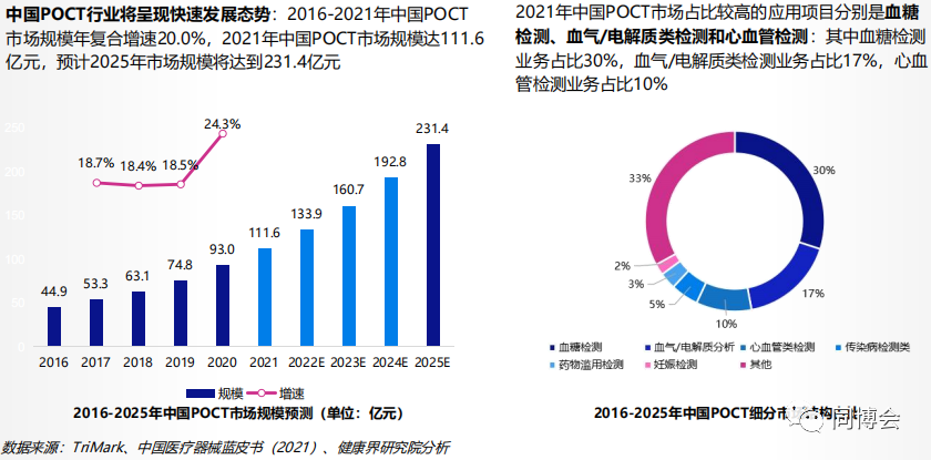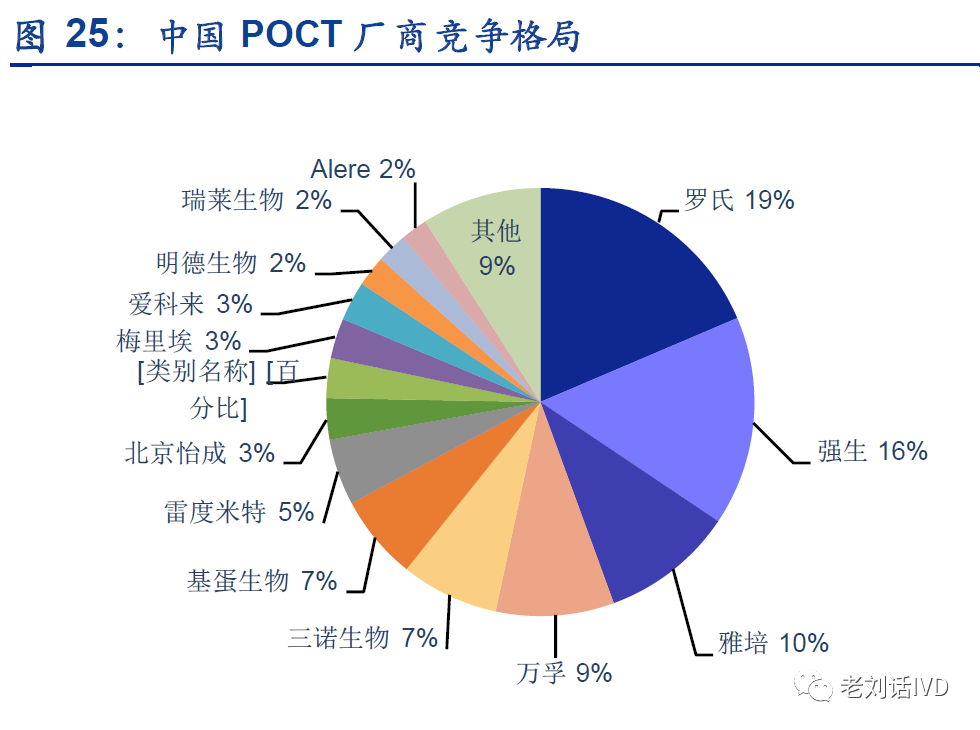 目前全球主要市场以心血管类POCT检测产品占据最大的份额(除血糖外),包括cTnl、Myo、CK-MB、NT-proNBP、D-dimer等多种检测试剂盒,我国则以感染类检测产品为主(除血糖外),包括PCT、CRP、高敏CRP、超敏CRP、HIV1/2、HCV等各类检测指标试剂盒,此外,还有血气/电解质类、妊娠/早孕类、肾脏类、毒品等多领域。 图表:POCT产品适用领域 我国POCT市场发展较晚,但近年来市场保持高速增长,年均复合增速高于我国体外诊断行业整体水平,属于体外诊断领域中发展较快的细分领域之一相较于传统的生化免疫市场,POCT的增速明显超过行业的增长率,基于新冠影响,POCT在未来的增速会更快,在所有的细分领域中,分子和POCT是未来的两大蓝海市场,未来的竞争会持续加剧。所有的POCT细分中,血糖占据了大头,其次血气/电解质。SAA、PCT、IL-6未来的市场潜力也不错。1、后疫情时代,医保在新冠期间拉小的后遗症,最终还是要医院来买单,毫无疑问,挤水分,医院、代理商、厂家,都逃不掉这一遭。大设备以后的进院会更难,相较于大设备,POCT的可操作性会好一点。 重要的事情说三遍,医疗改革是势在必行,只是时间的问题。免费的抗原以及免费的核酸,三年的时间大家可以想象花了多少钱,这些钱最后怎么处理,医保里面的钱快被掏空了,降本增效势在必行,新冠可能会成为DRG改革的加速剂,老刘估计,3-5年的时间,国家会完成这个变革。检验科单独成科室,这个目前已经有医院在实施,不过这个科室是不是只是单纯的看报告,还是可以给出指导意见,这个信号给出的意思,一定会是检验要向临床靠拢,临床也会懂更多的检验的知识,所以检验设备的临床化,未来是一个趋势,所以这就是POCT的一个意义之一。五大中心的建成,适用的场景完美契合POCT,这个给POCT的带来上百亿的增量。中国的竞争格局,新冠的红利会造就一部分国产的POCT龙头企业,未来POCT的竞争格局,将会快速变化,POCT在国内也会形成巨头鼎立的状况。 从万孚年报也可以看出,新冠抗原给企业带来的巨大能量(一个季度的销售超过了去年一年);九安的国外订单,也是让九安从一众的企业中脱颖而出,POCT企业抓住一波红利,可以直接起飞。任何的医疗设备都可以POCT化,未来POCT的市场前景非常好。未来POCT的发展方向。POCT确实是一个比较好的赛道,但是任何的产品,一定是质量为先,好的赛道一定会涌入很多的竞争者,如何在众多的竞争者中取得胜利,一定离不开好的产品,一些巨头的成功也不是一蹴而就,而是沉淀的积累,所以,如何把产品做好,如何把控质量,同样也是企业管理者应该思考的点。