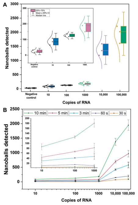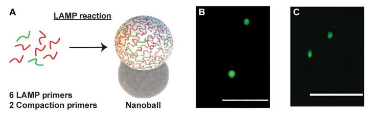 通过测量阻抗变化进行电化学检测DNA扩增是一个无标记替代荧光和比色技术。基于阻抗的生物传感器已广泛用于各种分析物,包括具有高灵敏度的蛋白质、核酸和癌细胞。此外,由于近几十年来的技术进步,电子元件经历了快速的小型化,大量减少的体积输入要求进一步提高了即时检测(POC)的可能性。 近日,一组由美国、中国、瑞典等多所顶尖大学研究团队在Science Advances杂志上发表了一篇题为“Digital assay for rapid electronic quantification of clinical pathogens using DNA nanoballs”的文章。在文章中,作者开发了一种简化的one-pot核酸等温扩增方法,可以通过电阻抗的变化来检测,而不需要微珠作为外部成核剂。作者改进了RT-LAMP反应,使扩增的DNA自核成纳米球,在微流体通道中,被动流动通过两个检测电极,在阻抗信号中产生量化尖峰。作者将其应用于SARS-CoV-2的检测,检测到的尖峰的数量与扩增DNA的数量相对应,因此病毒浓度更高。还展示了多种DNA和RNA致病序列的检测,包括来自各种病毒和细菌病原体序列,包括HIV、流感、结核分枝杆菌和β-内酰胺酶。这种技术为一种新的、简单的基于阻抗的多病原体POC核酸检测系统铺平了道路。 图片来源:Science Advances 自组装DNA纳米球 为了简化基于阻抗的DNA检测,作者开发了一种能够在一锅反应中生成DNA纳米球的分子方法,并且不需要外部成核剂。受先前滚动圈扩增(RCA)工作的启发,作者改进了LAMP反应,设计标准的六个目标特异性LAMP引物和两个额外的compaction引物,使扩增的DNA自核成纳米球,且纳米球的产生与等温DNA扩增平行(下图A)。当使用SARS-CoV-2 RNA测试此RT-LAMP反应时,可以在荧光显微镜下观察到自组装紧凑的DNA纳米球,直径从1到2 μm(下图B和C)。 DNA纳米球的自组装。图片来源:Science Advances 微流控装置中的阻抗检测 作者将简单的微流控芯片放在带有金电极的玻璃基板上(下图A和B)。微流控芯片采用毛细管作用驱动的被动流动,从而消除了复杂的微流控管和泵的需要。这种简单的被动流动使DNA纳米球通过的金电极上方的通道(下图D)并连接到电子读出系统。当纳米球通过金电极时,它会阻塞两个电极之间的电流路径和电场。这会产生阻抗的变化,从而在读出系统的输出处产生类似于图C至E所示的峰值特征。接下来,作者尝试改变compaction引物相对于LF和LB引物的浓度。结果显示使用更高比例的compaction引物 (9:1)产生更高的DNA纳米球数量(平均10分钟>100个),因此在接下来的实验中都使用了这个比例。 基于阻抗检测DNA纳米球的微流控芯片。 图片来源:Science Advances 检测限 研究团队以合成RNA为模板进行了梯度稀释实验,探索了该方法的检出限(LOD)。结果显示,即使是最低浓度的合成RNA测试(10拷贝RNA)也很容易与阴性对照区分开(下图A)。作者还在不同的时间间隔(5分钟、3分钟、60秒和30秒),测试了缩短电检测时间对LOD的影响。结果显示,即使在30秒,检测到的纳米球数量分布与初始合成RNA的浓度密切相关,并且在阴性对照组之间表现出统计学上的显著差异(下图B)。 检测限的分析。图片来源:Science Advances 三重复compaction引物设计导至信号增强 为了进一步提高系统的DNA检测能力,作者采用了几种策略。首先尝试增加DNA纳米球的大小或改变其电性能可能会增加信噪比,从而提高可探测性。为了增加DNA纳米球的大小,作者在compaction引物中添加一个额外的共同序列拷贝可能会增强LAMP扩增子压缩和形成纳米球的能力。结果证实了作者的推断,三重复compaction引物设计大大增加了检测到的平均DNA纳米球数量,从使用两重复compaction引物时的大约2000个增加到接近3000个(下图B)。 DNA纳米球检测实验方案的优化。 图片来源:Science Advances 临床样本中SARS-CoV-2的阻抗检测 为了测试此方法的适用性,接下来将其应用于检测来自临床诊断测试的上呼吸道拭子样本中的SARS-COV-2。随机选择了5个不同病毒载量的样本,通过RT-qPCR测量:低病毒载量(Ct 26-27),中病毒载量(Ct 22-24)和高病毒载量(Ct 17-20),并使用此纳米球方法进行检测。结果(下图A)证明了基于阻抗的检测在非提取的热灭活样品中检测临床相关病毒水平的能力,且病毒载量与检测到的DNA纳米球数量之间存在很强的关系。在Ct值(27到17)范围内检测到1000到2000个DNA纳米球。更重要的是,从SARS-COV-2阴性患者中检测到的阻抗峰值水平较低,尽管这些样本中的材料(咽拭子、鼻拭子和唾液)基质很复杂。 对COVID-19患者进行临床样本检测。 图片来源:Science Advances 利用DNA纳米球灵活检测病原体 为了证明此检测的灵活性和易用性,作者设计了针对多种病原体的LAMP三重复compaction引物,其中包括抗结核分枝杆菌、艾滋病毒、流感A/H1N1,以及一种常见的产生抗微生物药物耐药性的β-内酰胺酶基因。如下图B所示,使用所选病原体的合成遗传物质进行RT-LAMP(或LAMP)反应时成功检测到DNA纳米球。所有目标检测到的峰值均接近1000个,与阴性对照显著不同。这证明了将任何LAMP反应与基于阻抗的检测相结合的策略相适应的便利性。 对多种病原体序列进行临床样本检测。 图片来源:Science Advances 总结与讨论 研究团队提出了一种结合一锅等温生成DNA纳米球和电阻抗检测的新方法。通过使用compaction引物来改进环介导的等温扩增,扩增的靶标可以自组装成纳米球。接下来使用毛细管驱动的流动被动地让这些纳米球通过两个检测电极,在阻抗信号中产生量化尖峰。这种