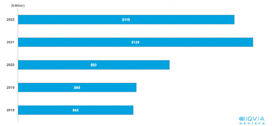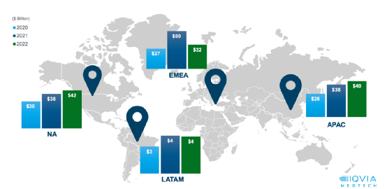 IQVIA在ADLM 2023国际市场大会上发布了最新的全球IVD市场数据。根据数据,在经历了新冠以来的强劲增长后,2022年IVD市场的增长放缓,全球IVD市场规模为1180亿美元,相比前一年的1290亿美元下降了8.5%。 新冠疫情前,全球IVD的体量在2019年达到650亿美元,年复合增长率为4%左右。受新冠影响,2020到2022年市场波动较大,但整体仍保持高速增长,2022年整体体量约为1180亿美元。随着新冠检测需求的降低,IVD市场已经进入回调期,并预计于2023年完成回调。由于COVID-19导至市场放缓,2022年全球COVID相关产品营收为410亿美元,较2021年减少了21%。而非COVID-19相关产品的营收则保持平稳。  2022年,全球大多数地区在都实现了健康增长,但由于COVID-19诊断产品的需求和采购量放缓,欧洲、中东和非洲地区的IVD销售总额出现了明显下降。2022年亚太地区的IVD销售总额达400亿美元,相比前一年实现了11.11%的增长。纵观一些大的头部企业,罗氏、迈瑞和希森美康在主要核心实验室市场的增长最为迅猛,凸显了跨国公司与亚太地区竞争对手之间的竞争关系。2022年,迈瑞在Heterogenous IA、临床化学及血液学领域实现了领先的增长态势,而罗氏则在Homogenous IA和尿液分析方面也达成了显著的增长。在细分领域上,IQVIA将市场分为五大块,分别是:床旁快检(POC)、中心实验室检测、病理、分子检测和糖尿病防控。2022年,POC、中心实验室检测和病理业务都处于增长中,而分子检测和糖尿病控制下行,均不同程度受到新冠趋势的影响。虽然传染病快速检测和即时免疫分析领域的表现不佳,但DAT快速检测、内分泌快速检测、门诊化学检测、血气分析、即时HbA1c分析等领域都实现了正增长。2022年北美地区CGM市场份额占血糖监测市场的77%,西欧地区CGM市场份额也达到69%。由于糖尿病患者对CGM设备的认知度提高、报销范围扩大和技术倾向增强, BGM在发达地区(如北美和西欧地区)的市场份额将继续加速萎缩。相反,IQVIA预计新兴市场(如亚太地区和拉美及加勒比海地区)将保持BGM的市场份额,原因是患者基数不断增长,诊断和治疗率提高,而 CGM 技术的普及速度较慢(因为普遍报销不足、自付费用较高和人均收入较低)。2022年,亚太地区和拉美及加勒比海地区的CGM市场占比分别为22%和10%,而BGM在这两个地区的市场份额分别达到78%和90%。新冠的POC市场迅速回调,新冠之外的POC技术和产品市场机会增多,医生办公室、药房、各类诊所、急救中心及各类养老和护理机构等各个检测点均会快速增长,也预示着POC市场放量的巨大潜力,主要包括心血管代谢相关、非新冠的呼吸道检测和性病检测类产品。全球IVD产业由新冠带来的波动,预计在2023年会迎来触底。商业上,疫情后行业收购和并购浪潮中也会出现更有竞争力的玩家,引领行业的发展和加入全球的竞争中。疫情前,整体医疗器械出海的增速约25%左右。疫情加速了整体医疗器械的出海。其中,IVD占整体医疗器械出海的15~20%。根据IQVIA预测,未来IVD的出海依然可以保持约12%的增速。出海进程较快的产品包括:分子诊断、POC和中心实验室的免疫检测。其他如中心实验室的生化检测和微生物检测,出海的进程相对较慢。决定出海的核心因素主要有两点:一是需求,二是难度。出海进程较快的产业都属于需求强,且出海难度低。而出海进程慢的产业,虽然也有一定的需求,但是通常难度比较高。在出海模式上,IVD公司出海分为三类:原材料/试剂出海、产品出海和服务出海。原材料的出海的模式是和科研机构和大厂合作,出海目的地以欧美市场为主。产品出海方式主要以经销和直销为主,经销/贸易型出海一般需要经过“选培育优”四个阶段,关键是找到靠谱的经销商。而直销模式中,直销国家的选择和评估是关键,比如美国,加拿大等30多个被认证为本土化出海潜力国家。服务出海,目前还是以LDT模式为主。出海目的地也因科研还是医疗市场而不同。科研市场上,已经打入北美欧洲日本等高端市场;但在医疗市场上,主要还是进入与国际上与我国联系密切的国家和地区,比如一带一路国家和地区。 根据IQVIA的报告,总体而言IVD市场前景看好,除去COVID-19相关销售的影响,预计IVD市场在未来五年将以+4%的复合年均增长率增长。