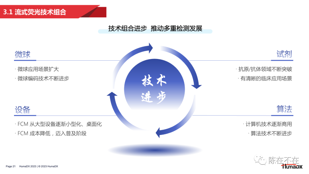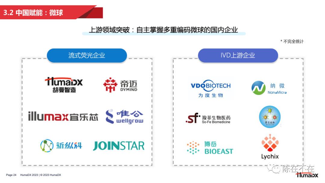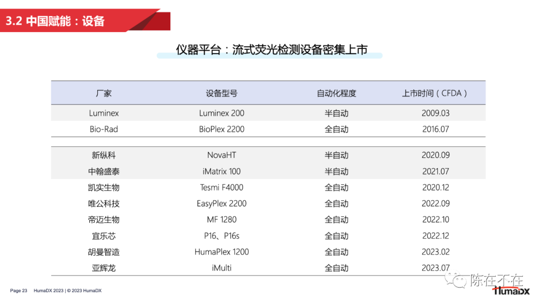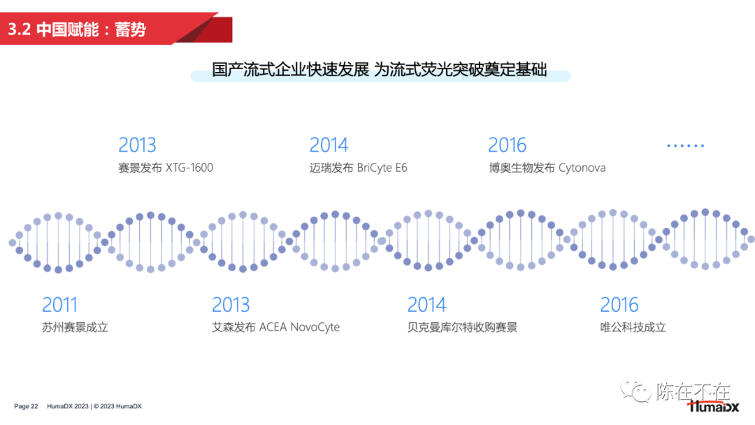 3 — 朝阳:流式荧光的中国赋能 随着技术发展,中国企业对流式荧光的关注度越来越高,也有越来越多的企业以自主研发的形式入局赛道。这一部分将从发展背景、产品现状、机遇挑战这几个方面对国产流式荧光的发展进行分析。 首先我们先回顾一下文章开头提出的问题——“为什么直到1997年,将流式细胞术和免疫检测相结合的流式荧光技术才被发明出来?” 在回顾了流式荧光的早期发展历程之后,答案其实已经呼之欲出:因为流式荧光技术的发展,离不开微球、试剂、设备、算法这一系列技术组合的共同进步。在上世纪七八十年代,微球更多用于流式细胞仪的校准,随着技术发展,微球才逐渐被用作免疫诊断中的固相载体。之后,随着BD公司和Luminex公司在编码微球技术上的不断突破,实现了几十乃至上百重的编码重数,才使得微球从仪器校准的工具演变为多重检测的核心技术。其次,随着单克隆抗体技术的出现,免疫学检测的范围越来越广,使流式荧光技术拥有了清晰的临床应用场景。此外,由于激光器和光学部件的革新,流式细胞仪逐步实现小型化、桌面化,成本也不断降低,为流式荧光的出现做出铺垫。最后,台式计算机在90年代的普及,以及随之而来的软件算法发展,也让多重检测、微球分群成为可能。 无论是流式细胞术还是流式荧光技术,中国企业相比欧美都起步较晚。2011-15年,中国的初代流式企业陆续登场,带来了第一批国产流式细胞仪;2015-16年,随着头部企业战略调整,一批优秀人才迈出自主创业的步伐,催生了第二批流式明星企业的诞生。本土企业的百花齐放推动了流式细胞术在临床的开展,也为流式荧光技术的国产化打下了坚实的基础。分析流式荧光设备的上市时间可以看到,2020年,国产半自动流式荧光设备开始出现;2022年起,全自动设备密集获批。可以说,正是由于本土流式企业在人才、技术上的积淀,才有了国产流式荧光的迅速发展。