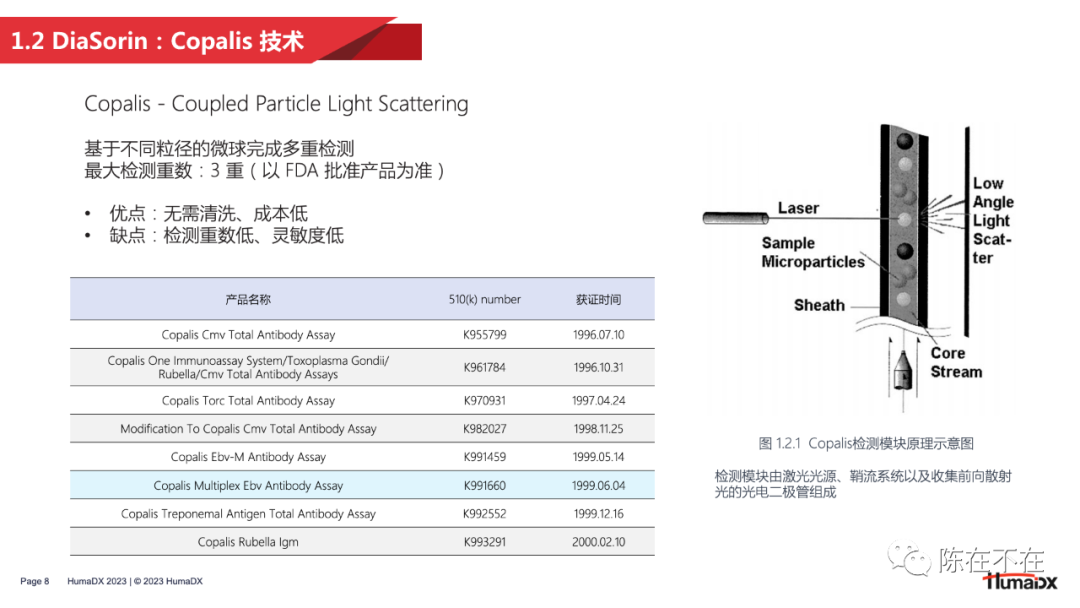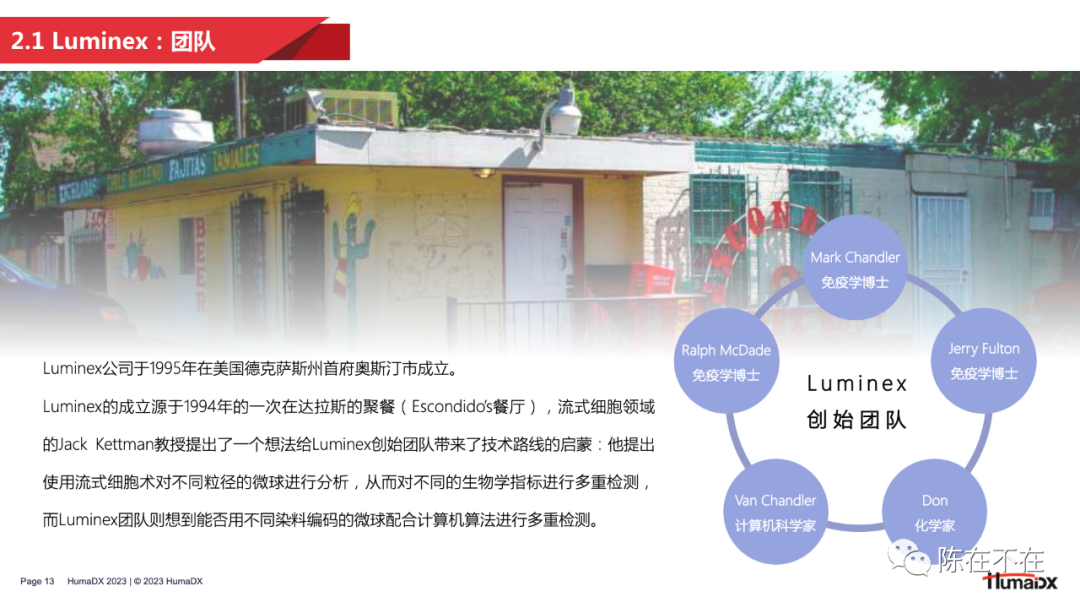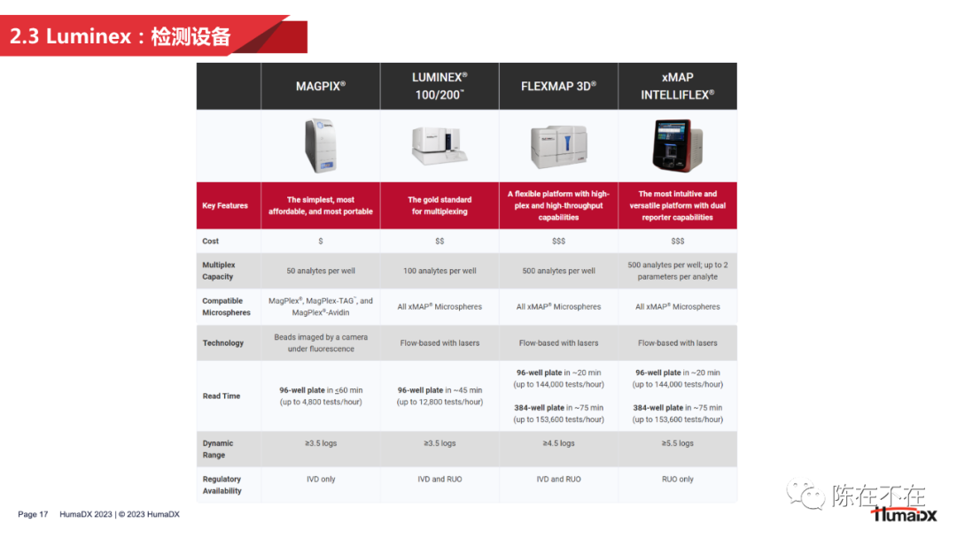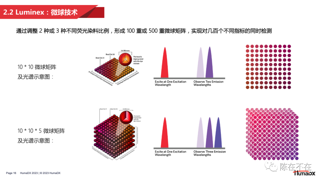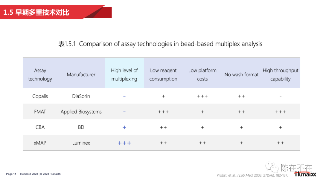 流式荧光技术的发明并非一蹴而就。从上世纪80年代开始,就有许多研究者对多重检测做出过探索。其中比较有代表性的例子包括将凝集检测和流式相结合的 PACIA 技术,以及加拿大学者在1993年做出的使用不同粒径微球进行多重检测的研究。  在商业端,DiaSorin、ABI 以及 BD 公司都曾对多重检测做出过探索。DiaSorin 将凝集法和流式技术结合,开发出了 Copalis 技术,仅通过前向散射光检测未凝集的单体微球的粒径,从而反算出待测物的含量,实现定性或半定量检测。 而在分子生物学领域大名鼎鼎的 ABI 公司则以类似拍照的原理,在90年代末期推出了名为 FMAT 的检测平台。但这一平台仅能对两种荧光染料染色的微球进行检测。 和 Copalis 一样,FMAT 也在应用有限、市场接受度低的原因下逐渐走向消亡。 有学者曾将90年代出现的多重检测技术进行了汇总,并从检测重数、试剂消耗量、仪器成本、清洗步骤、通量水平等多个维度进行了分析。 可以看出,至今仍然在科研和IVD领域应用的 CBA 和 xMAP 技术都在检测重数上具有明显优势。2 — 黎明:Luminex启幕流式荧光 接下来,将从团队组成、微球技术、产品信息及中国合作这几方面,对流式荧光技术开创者 Luminex 公司进行分析。 从 Luminex 的创始故事和团队可以看出,一家卓越的流式荧光企业应该具有 4 大能力拼图:材料学即微球研发能力、试剂研发能力、仪器开发能力,以及市场定位能力。这样的能力组合才能保证开发的产品既契合多重检测的技术特点,也满足市场实际应用需求。 微球方面,Luminex 最早推出的是 5.6µm 的 MicroPlex 聚苯乙烯微球,主要应用于科研领域。在IVD领域,出于样本前处理的需要,Luminex 接着推出了便于磁分离的 MagPlex 磁性微球。多重编码方面,Luminex 在最初的100重微球矩阵之外,通过增加荧光染料,将微球编码重数提高到了500重。不过500重编码的微球只能应用于 3D 和 Intelliflex 平台。