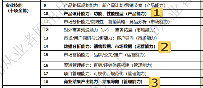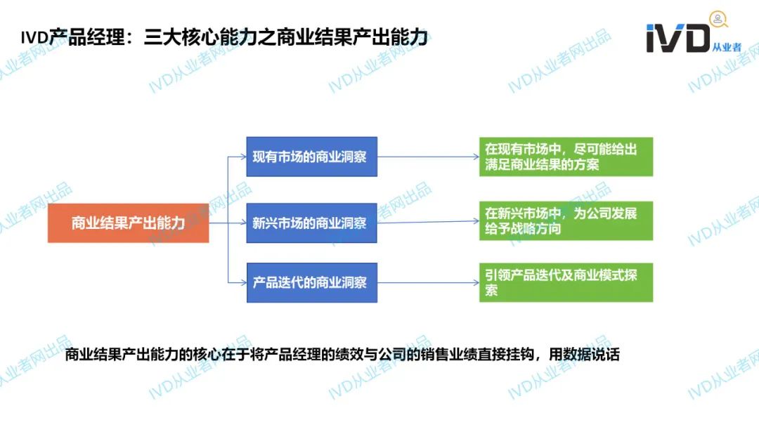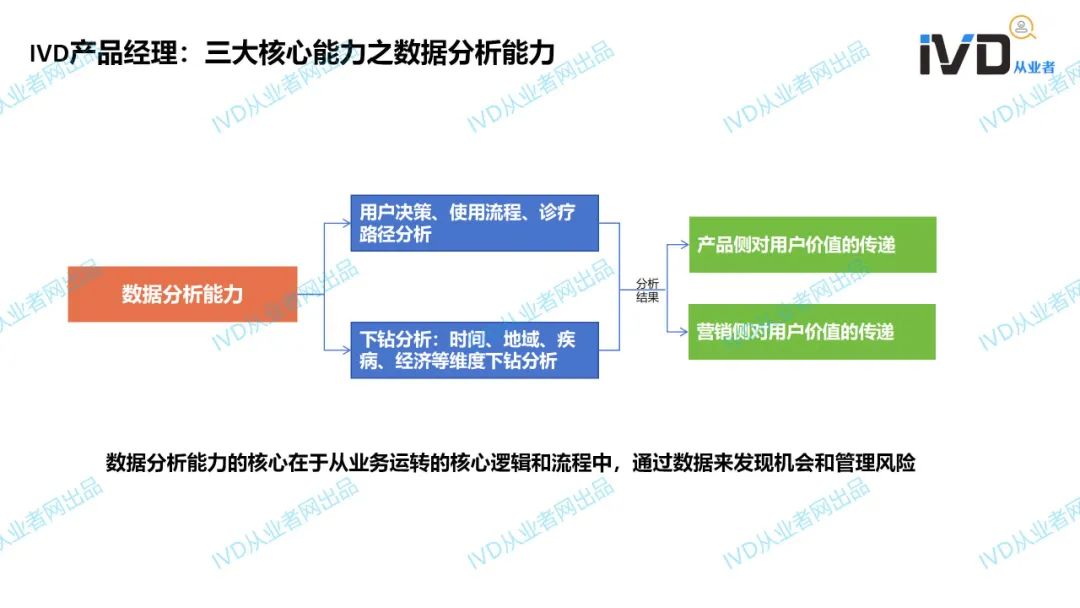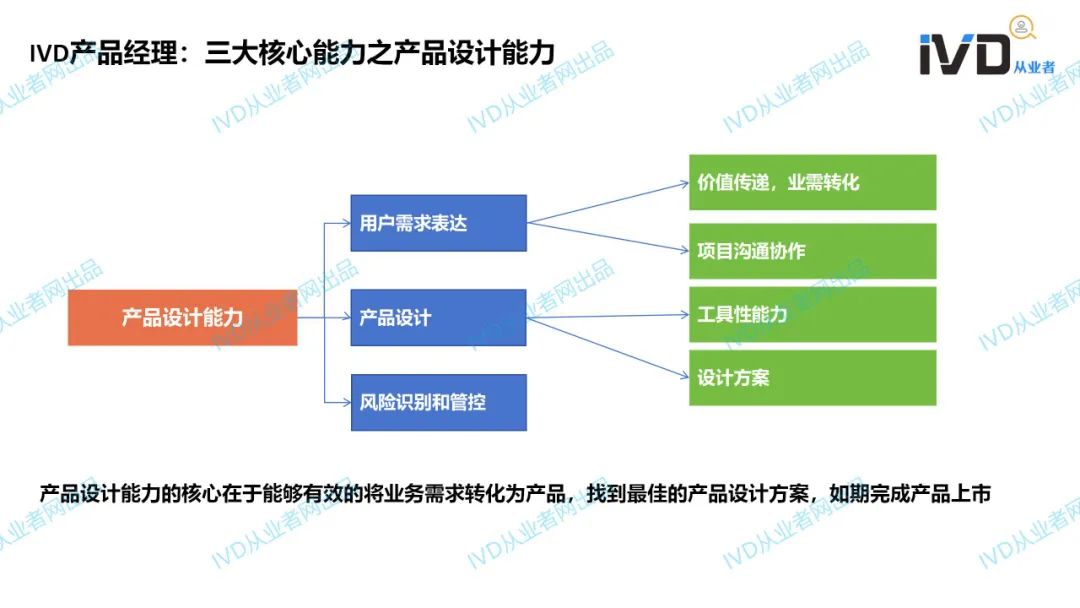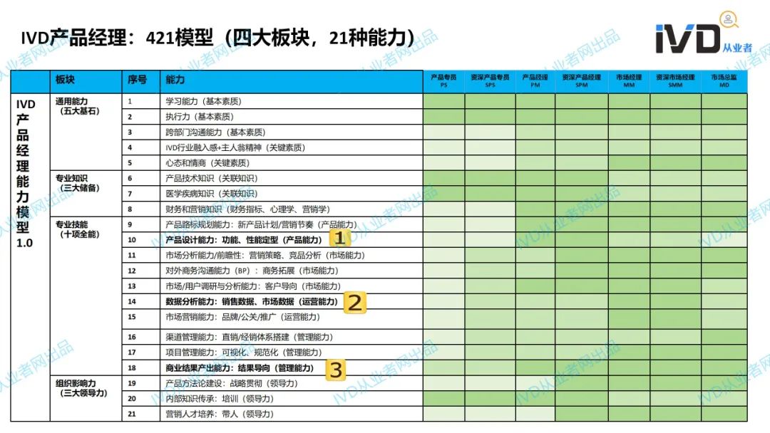 IVD产品经理的能力模型分为四大板块,21种细分能力,因此我们也把这版的能力模型称为“421模型”。四大板块分为通用能力、专业知识、专业技能和组织影响力。 通用能力板块——五大基石 这个板块我们最初的想法是把一些IVD产品经理应该必备的一些基础能力罗列出来,因此也将其称为整个421能力模型的“五大基石”。 首先就是学习能力,IVD产品经理作为企业和市场的链接者,只有持续学习才能不会落后于市场; 其次是执行力,把执行力放进来的原因是,我们认为只会“纸上谈兵”、只会做PPT的产品经理是不合格的,具有执行力才有杀伤力; 第三是跨部门沟通能力,在其他部门这个能力可能不那么重要,但是对于产品经理这个岗位而言,跨部门沟通能力能够保证信息的及时性和有效性,对于很多决策是至关重要的,同时我们也见过很多蒙头干活,不注重沟通的IVD产品经理,最后只能自娱自乐,对业绩增长无效,这种产品经理,我们认为能力上也是有短板的,所以将跨部门沟通能力作为五大基石能力放了进来。 第四是IVD行业融入感,或者是主人翁精神,作为IVD行业的产品经理,应该是热爱这个行业,并在这个行业中的某个细分领域具有自己独到见解的从业者(现在或者是未来),敢于去表达自己的行业观点,策略,而不是人云亦云,就要求产品经理要有主人翁精神,不能将其单单视为工作任务完成,可能是见过太多浑水摸鱼的产品经理,所以我个人对这点特别看重,这也是五大基石能力的核心。 第五是心态和情商,产品经理我一直认为是公司内部挫败感最强的岗位之一,因此需要调和的部门利益太多,所以心态至关重要,其次就是情商,在这个岗位上懂得平衡各方利益,既能达到自己的目的,又不会惹得众怒。 专业知识板块——三大储备 第二个板块是专业知识板块了,我们专门将其分为了三个部分,第一个部分是产品技术知识部分,也就是产品经理应该对于自己所负责产品的技术原理,发展趋势,优劣势足够了解。 第二个部分,是医学疾病知识,和自己产品相关的疾病领域的知识,要求熟悉诊疗习惯、诊疗路径,用药方案等等 第三个部分是财务和营销知识,基础的财务知识是产品经理必须要储备的知识,企业所关心的财务指标有哪些?怎么达成,有人说PM就是未来的GM,除了财务知识,心理学知识,营销学知识也应该有所储备。 专业技能板块——十项全能 专业技能板块是421能力模型的核心板块,这个板块是真正决定产品经理水平高低的板块。 10项能力又可以分为产品能力、市场能力、运营能力和管理能力;首先是产品路标规划能力和产品设计能力,前者主要注重公司策略及规划,后者主要注重产品的业需转化,简单理解就是前者需要告诉公司未来几年上市哪些新产品,市场该怎么打,后者就是告诉研发部,市场需要一个什么样的产品。 在市场能力部分,市场分析能力主要注重产品经理对市场发展的前瞻性,能够把握市场的动态和发展,及时给到公司以调整策略,能够掌握竞品的动态,及时制定应对措施。 市场能力部分我们也将对外商务沟通能力放了进去,主要就是考虑到当下IVD行业是一个竞合阶段,单纯的竞争已经无法快速帮助公司发展,只有在竞争中合作,在合作中竞争才能博得公司利益最大化。 运营能力放了两项,第一项就是数据分析能力,这里指的是广义的数据分析,既包含了数据的收集和处理,也包含了数据的分析,后面会做详细介绍。运营能力中市场营销能力范围是产品的内外部品牌管理,软文推广,危机公关之类的技能。 最后是管理能力部分,专门放入了渠道管理能力,这是很多IVD产品经理之前从未接触过的领域,之所以放进去的原因是,这两年过来,我们愈发的发现,渠道管理对于产品经理在制定产品战略时的重要性,从公司内部来看,渠道管理不是产品经理的职责,但是产品经理需要掌握这项技能。 项目管理能力是管理能力的重要一环,不管是研发项目也好,促销项目也好,按照可视化、规范化进行管理是至关重要的。 管理能力的核心部分是商业结果产出能力,这也是综合体现产品经理工作成绩的一个指标,一项策略从制定到执行,到出结果才算完成,无法落地和没有成果的策略都是失败的策略,所以IVD的产品经理不仅要管策略制定还要管结果达成。 组织影响力——三大领导力 产品经理有两个客户,一个是外部客户,一个是内部客户,其中和内部客户息息相关的就是组织影响力,一个IVD产品经理如果在营销体系中没有影响力,那就只能做打打杂的工作,只能做做彩页,讲讲科会,也就是产品专员的阶段,想要晋升至产品经理,必须重视组织影响力。 这里我们罗列了三大能力,一个是产品方法论建设,也就是让整个团队,整个公司能够落地贯彻产品策略,这是影响力的体现,也是影响力的形成,第二个是内部知识传承,产品和策略不仅自己要懂,还要讲述给其他人懂,所以需要产品培训,策略培训,其中培训技巧就是这部分能力的要素。第三个是营销人才培养,好的产品经理,不是这个人好,而是这个人所在的团队大家都好,把每一个人都变成产品经理,让每一个销售都能像自己一样给客户推广产品。 IVD产品经理:三大核心能力打造 前面跟大家介绍了21项能力,在这些能力中,我们反复权衡对比,找到了三大核心的能力,这也是真正拉开IVD产品经理差距的能力要求。第一个就是产品设计能力。 产品设计能力之所