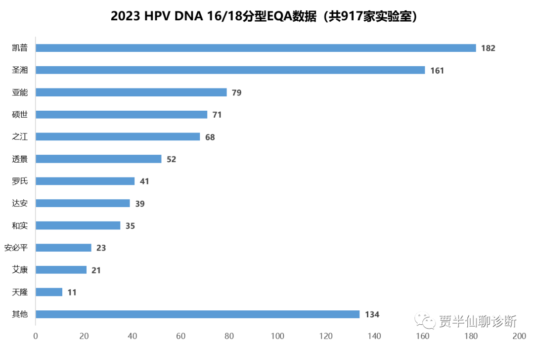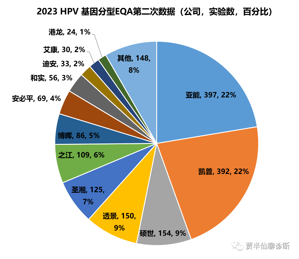 先看前者,不分型产品,主要应用在两癌筛查领域。从2023第二次EQA数据可以看出凯普、圣湘领先优势比较大,排名3-5的分别是亚能、硕世和之江。