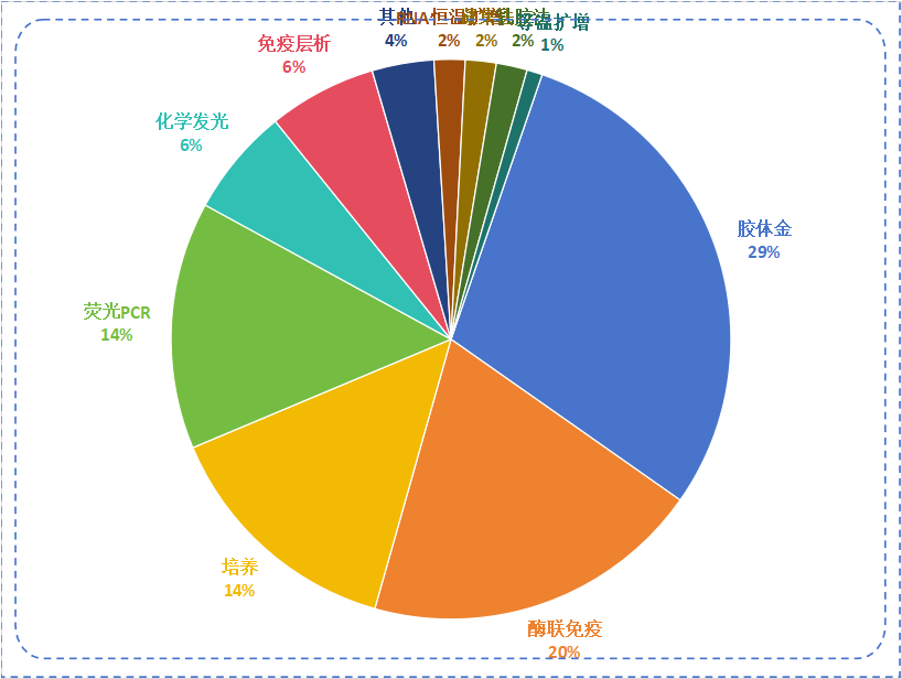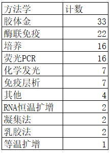 从方法学来看,目前获批的肺炎支原体的检测试剂盒中,胶体金共有33款,酶联免疫22款,培养16款,荧光PCR16款产品。