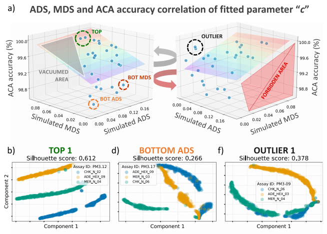Smart-Plexer通过距离测量(如欧几里得距离)来分析每个靶标的s型曲线之间的差异。使用平均距离评分(ADS)和最小距离评分(MDS)排序多重检测。选择评分高的多重检测进行实验测试,并使用ACA方法评估每个多重检测在靶标识别方面的分类性能。高评分和低评分多路复用之间靶标间距离的差异,导至不同的ACA分类精度。